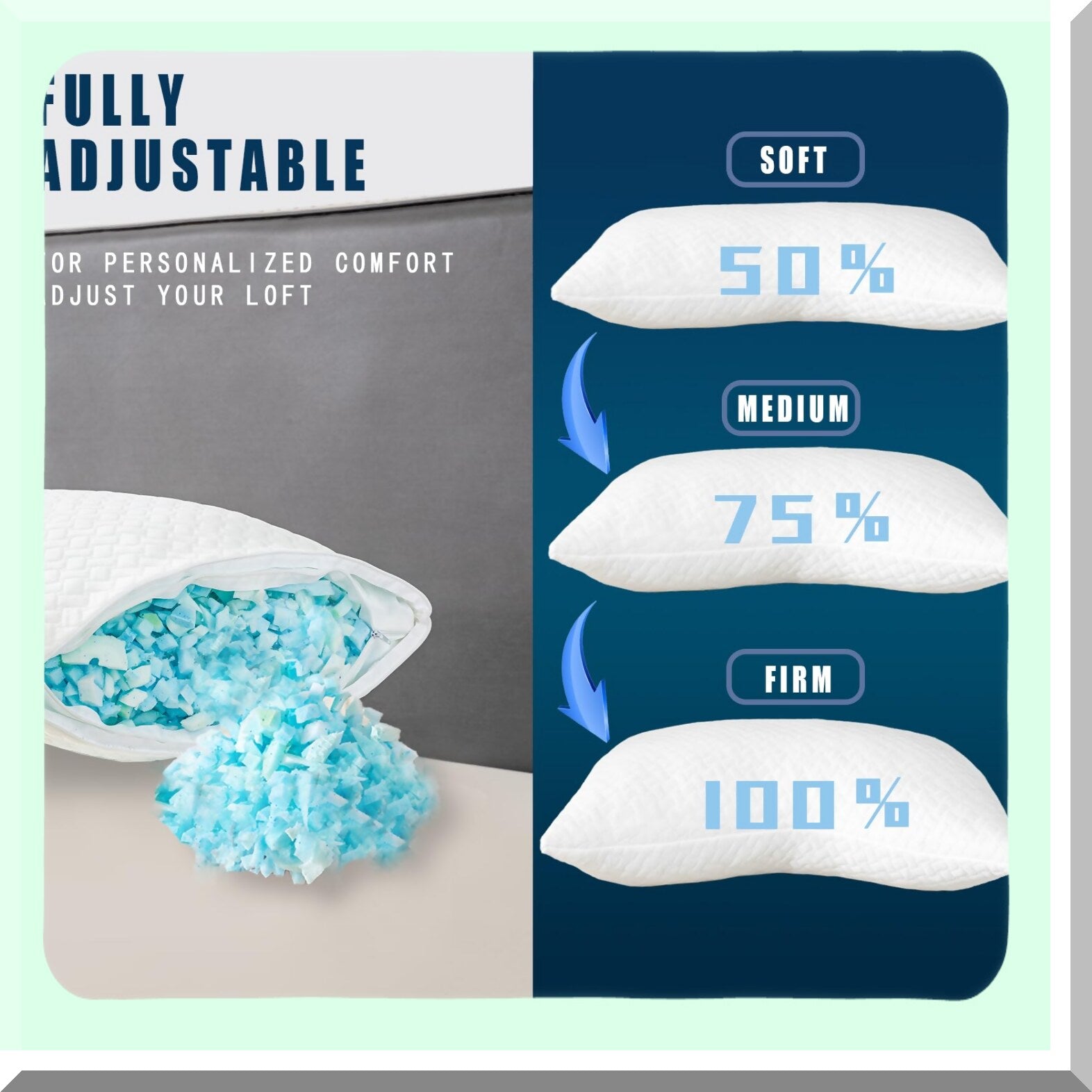 The fully adjustable pillow allows users to customize the amount of foam fill to suit their size, shape, and sleep position. This feature provides personalized comfort and support for a better night's sleep. The easy access zipper makes it convenient to adjust the pillow to meet individual preferences. This practical benefit prioritizes usage advantages by giving users control over their sleeping experience, ultimately leading to improved sleep quality and overall user satisfaction.