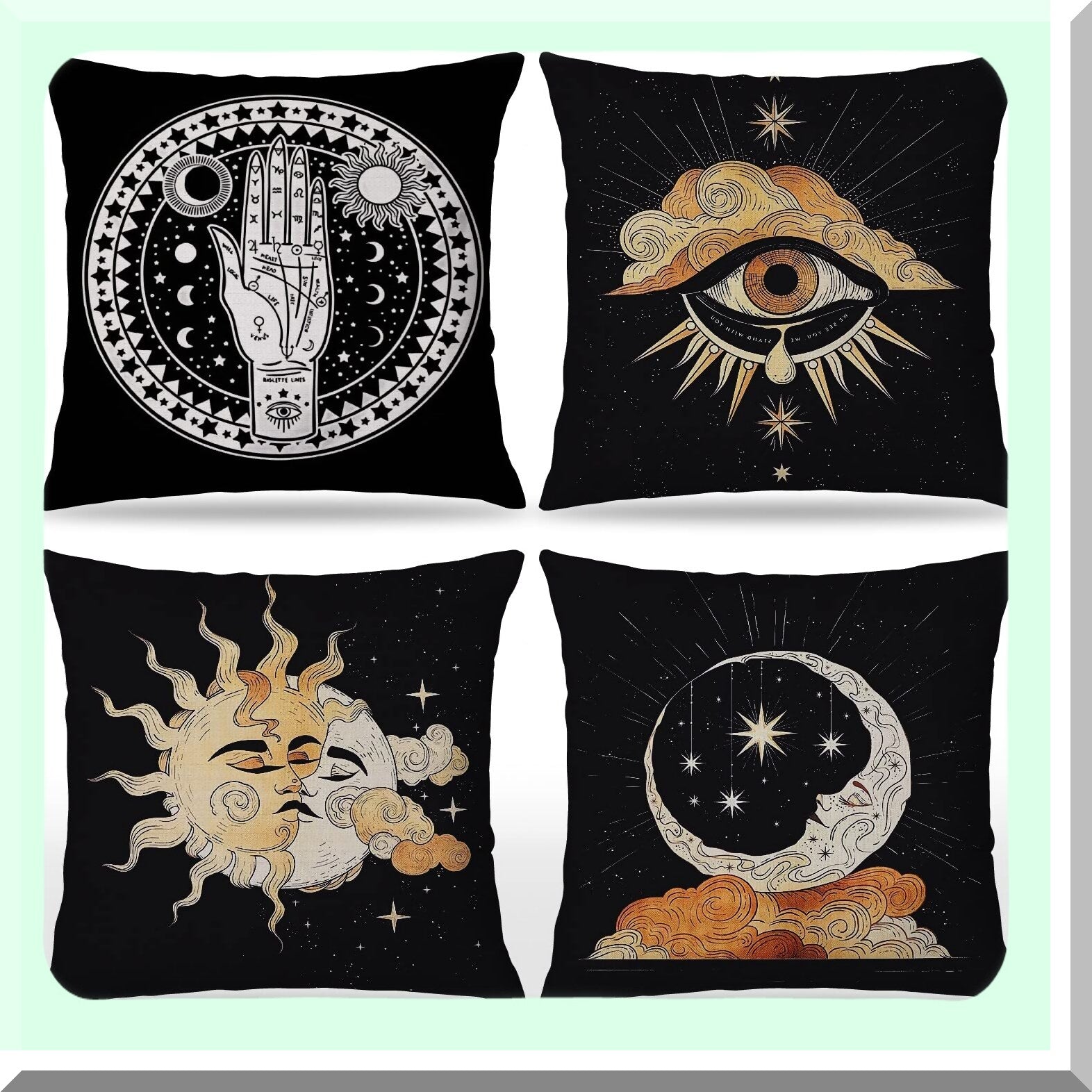 Mystical Astrology Tarot Palmistry Throw Pillow Covers - Set of 4, Sun Moon Star Decor for Bedroom, Living Room, Girls Room, College Dorm - 18 x 18 Inches, Tarot Lovers Gifts