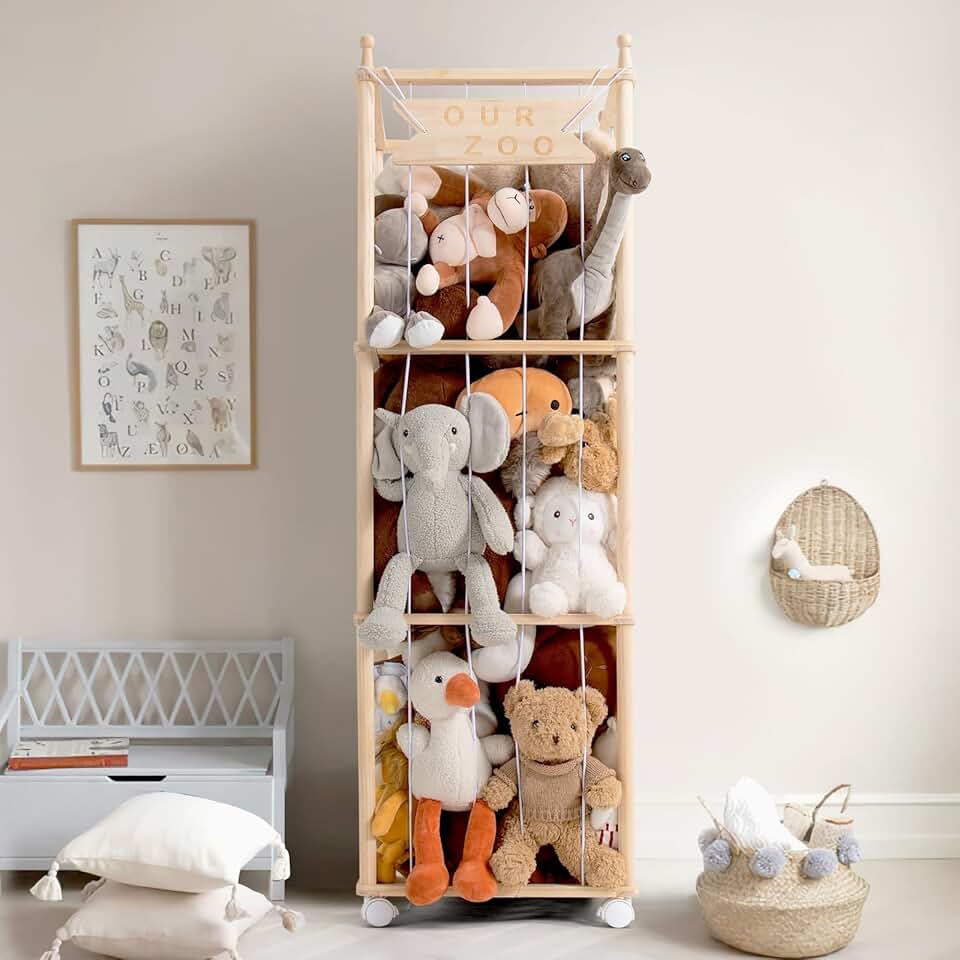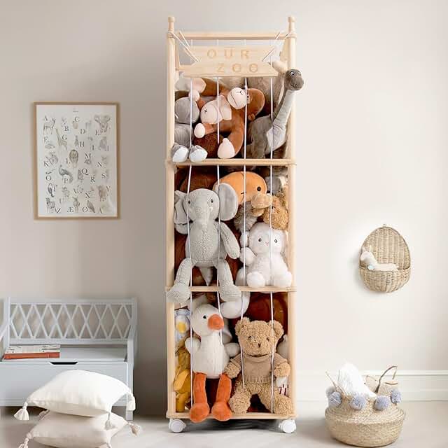 This stuffed animal storage features a wooden design with a spacious 54-inch height, providing ample space for organizing plush toys. Its sturdy construction ensures durability and stability, making it suitable for nurseries, playrooms, kidrooms, and bedrooms. The storage unit helps keep spaces tidy by offering a dedicated area for stuffed animals, reducing clutter and creating a neat environment. Its large capacity allows for the storage of numerous plush toys, making it ideal for children who love collecting stuffed animals. The design is both functional and attractive, blending well with various room decors. Easy to access and organize, this storage solution encourages children to develop good tidying habits. It also makes a thoughtful gift for birthdays, holidays, or special occasions, helping to create a fun and organized space for kids to play and relax.