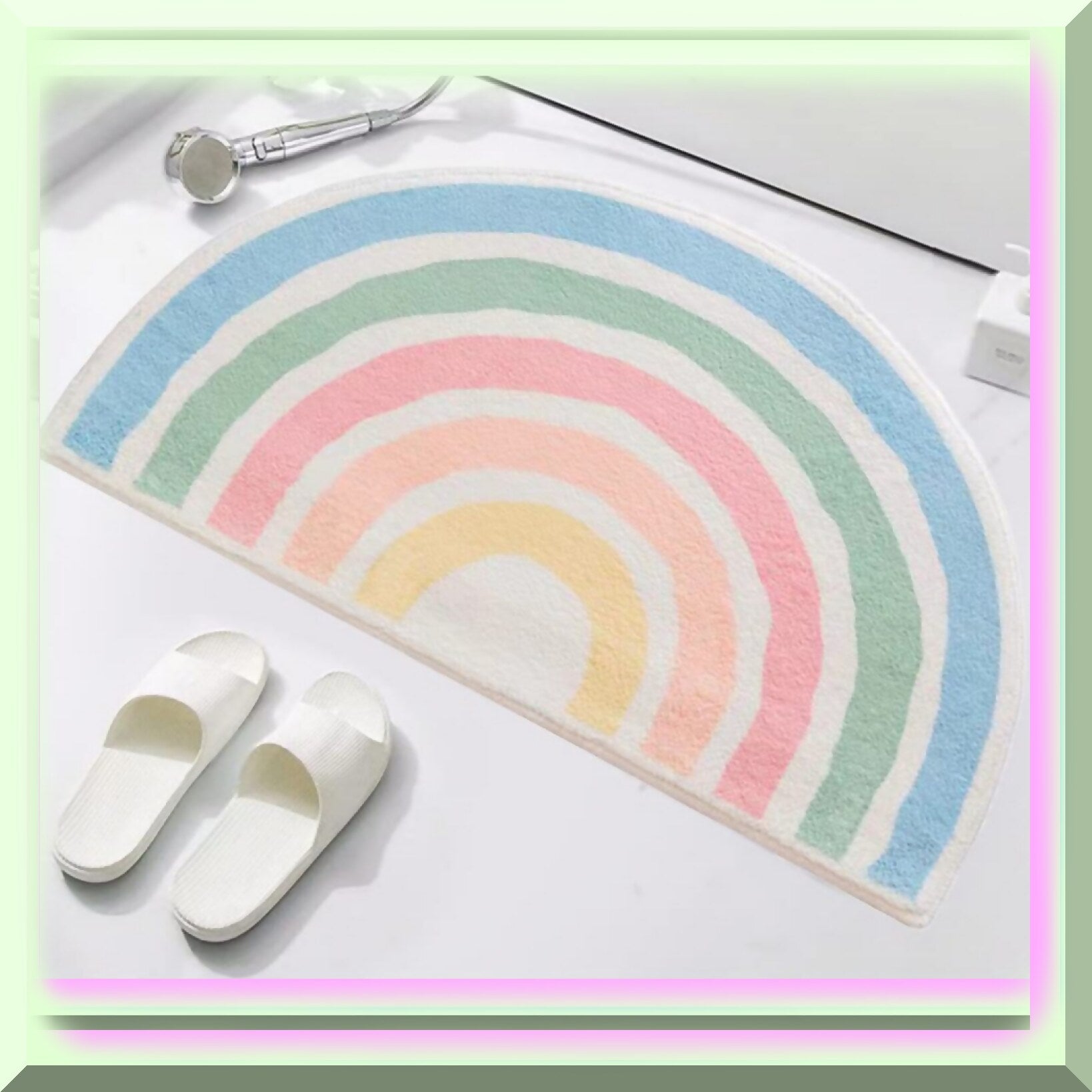 This bathroom rug features a charming rainbow pattern, adding a lively touch to your space. Made from soft, plush microfiber, it offers a warm, hygroscopic, and breathable surface that feels comfortable underfoot. The long fluff and fine texture provide a plush, cozy experience, while the edging process ensures durability and a neat appearance. Crafted with fine manufacturing technology, the rug resists shedding and maintains its quality over time. Its lightweight design makes it easy to handle and clean—simply dust off or rinse with water for quick maintenance. The non-slip backing enhances safety, preventing slips and falls. Its absorbent microfiber material effectively soaks up water, keeping your floors dry and clean. Perfect for indoor use, this super soft floor mat combines functionality with a cheerful rainbow aesthetic, making it an ideal addition to entrances, bathrooms, or any indoor space that benefits from a touch of comfort and color.