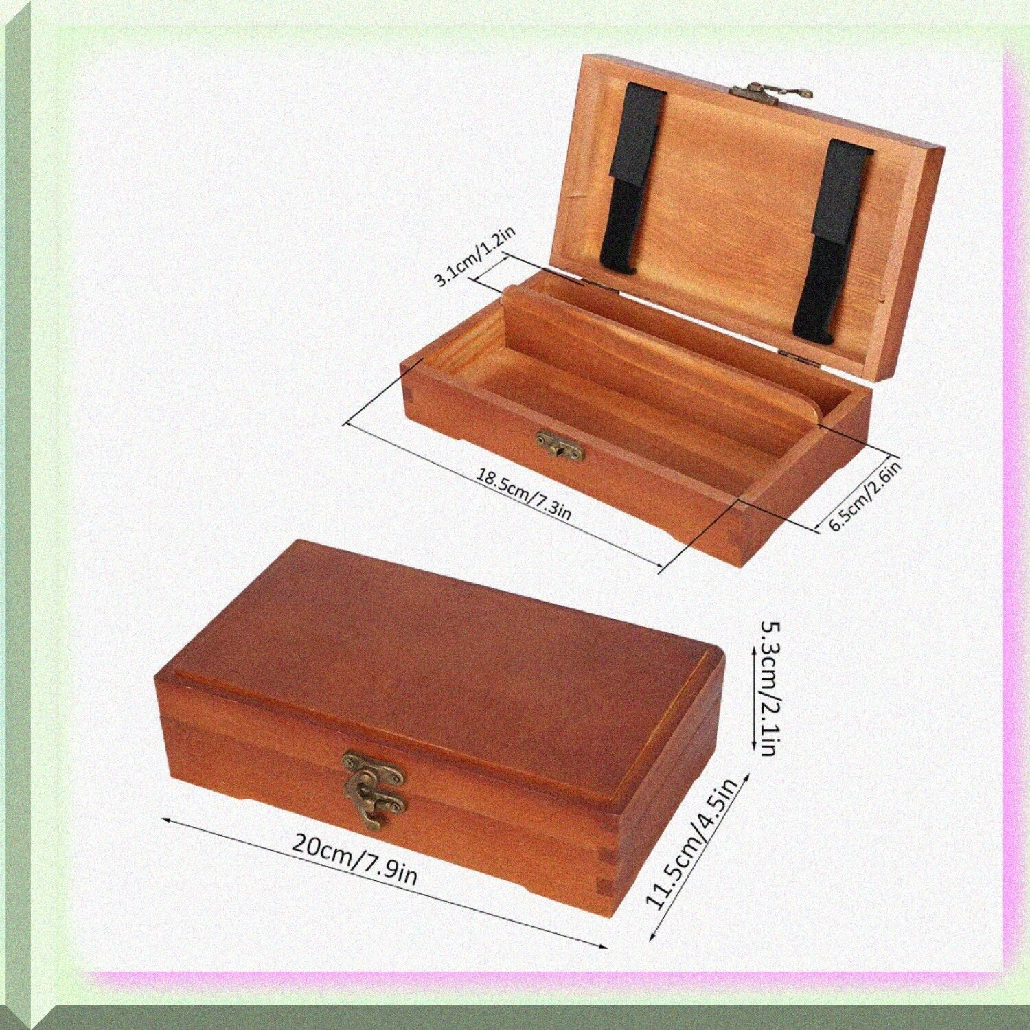 This small vintage wooden storage box features a hinged lid and lock, offering a charming retro appearance. Made from solid wood, it serves as a versatile stationery case, pencil box, cosmetic case, or storage container. The design includes a large capacity, with the ability to hold up to 48 pencils when the compartment is removed, making it ideal for sketching and hobby storage. The box measures approximately 20 x 11.5 x 5.3cm (7.9 x 4.5 x 2.1in), with a small compartment of about 18.5 x 3.1cm (7.3 x 1.2in) and a large compartment of roughly 18.5 x 6.5cm (7.3 x 2.6in). Its retro color and styling enhance its aesthetic appeal, while the included partition helps organize your supplies efficiently. This vintage-style wooden box combines functionality with a nostalgic look, making it a practical addition to your stationery or cosmetic collection.