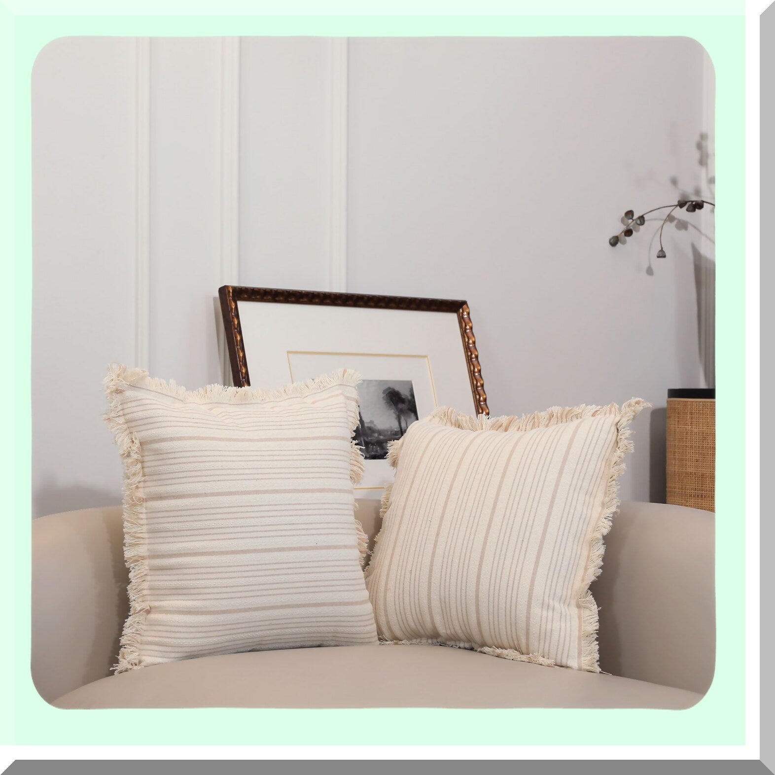 Fringe Stripe Khaki Pillow Cover - Boho Farmhouse Decor - Indoor/Outdoor Accent Cushion Case - Neutral 16x16 Inch Throw Pillow Cover - Set of 1