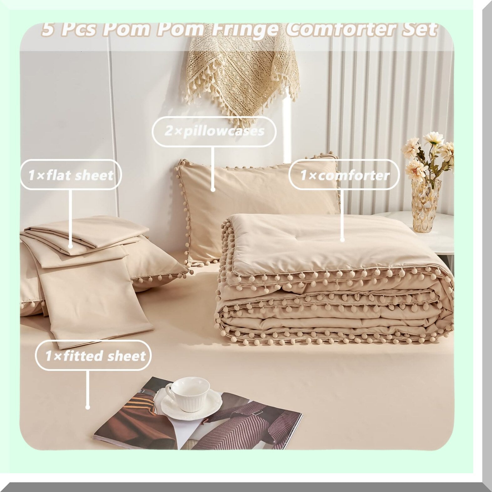 Boho Chic Pom Pom Fringe Comforter Set - Soft Queen Size Bedding with Sheets & Solid Bed in a Bag for Girls & Adults - Khaki Comforter Set