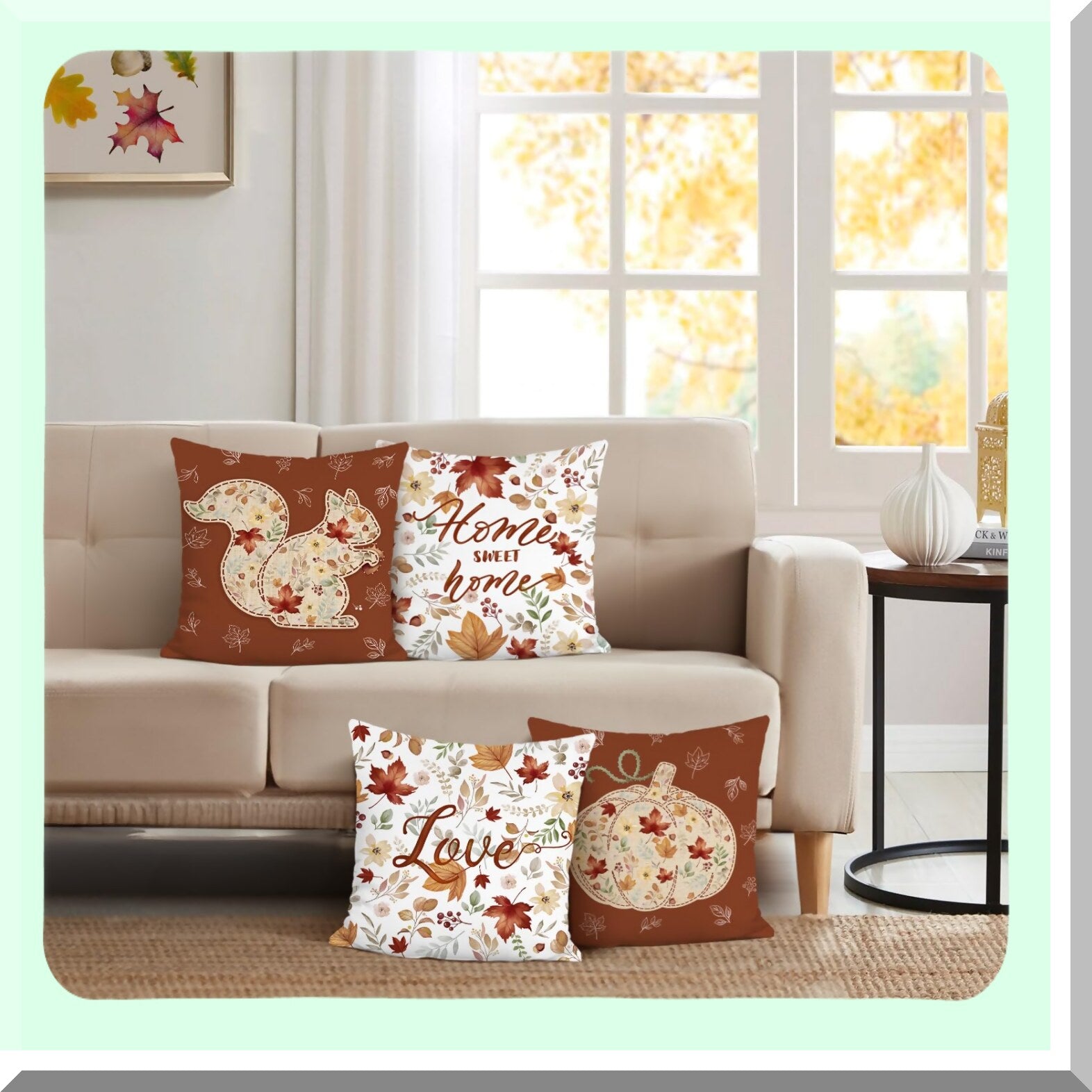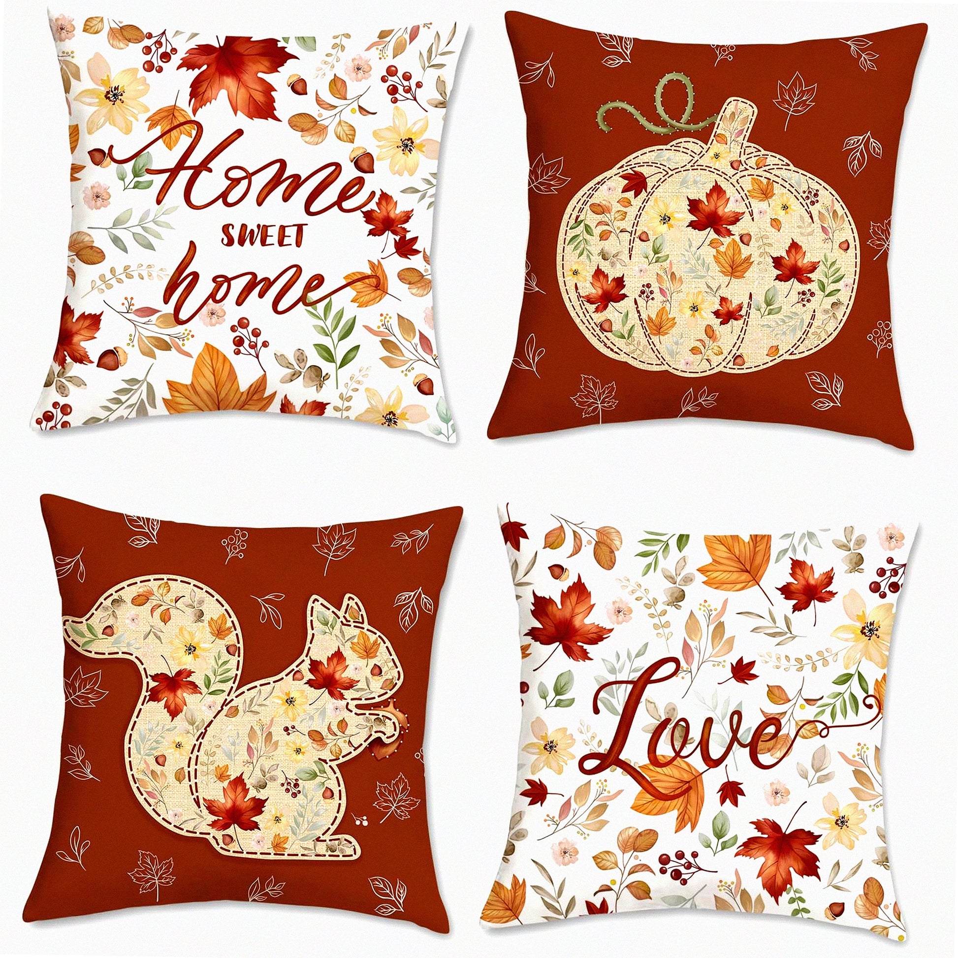 Autumn Bliss Pillow Covers - Set of 4 18x18 Inch Velvet Cushion Cases with Leaves, Squirrel, and Pumpkin Decorations for Couch and Sofa Home Decor