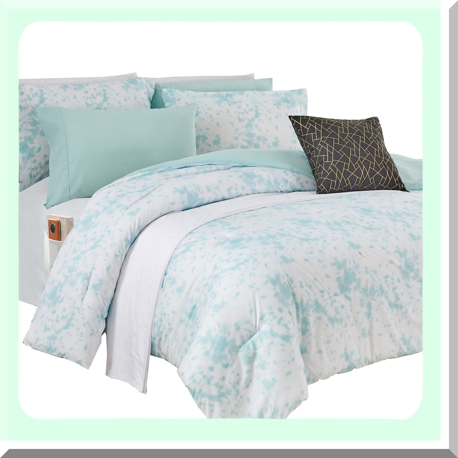 Aqua Mint Tie-Dye Dream Set - Reversible 10-Piece Comforter with Smart Pockets, Decorative Pillow, Fitted Sheet - Soft Plush Lightweight Material - Queen Size - 10pc Bedding Set