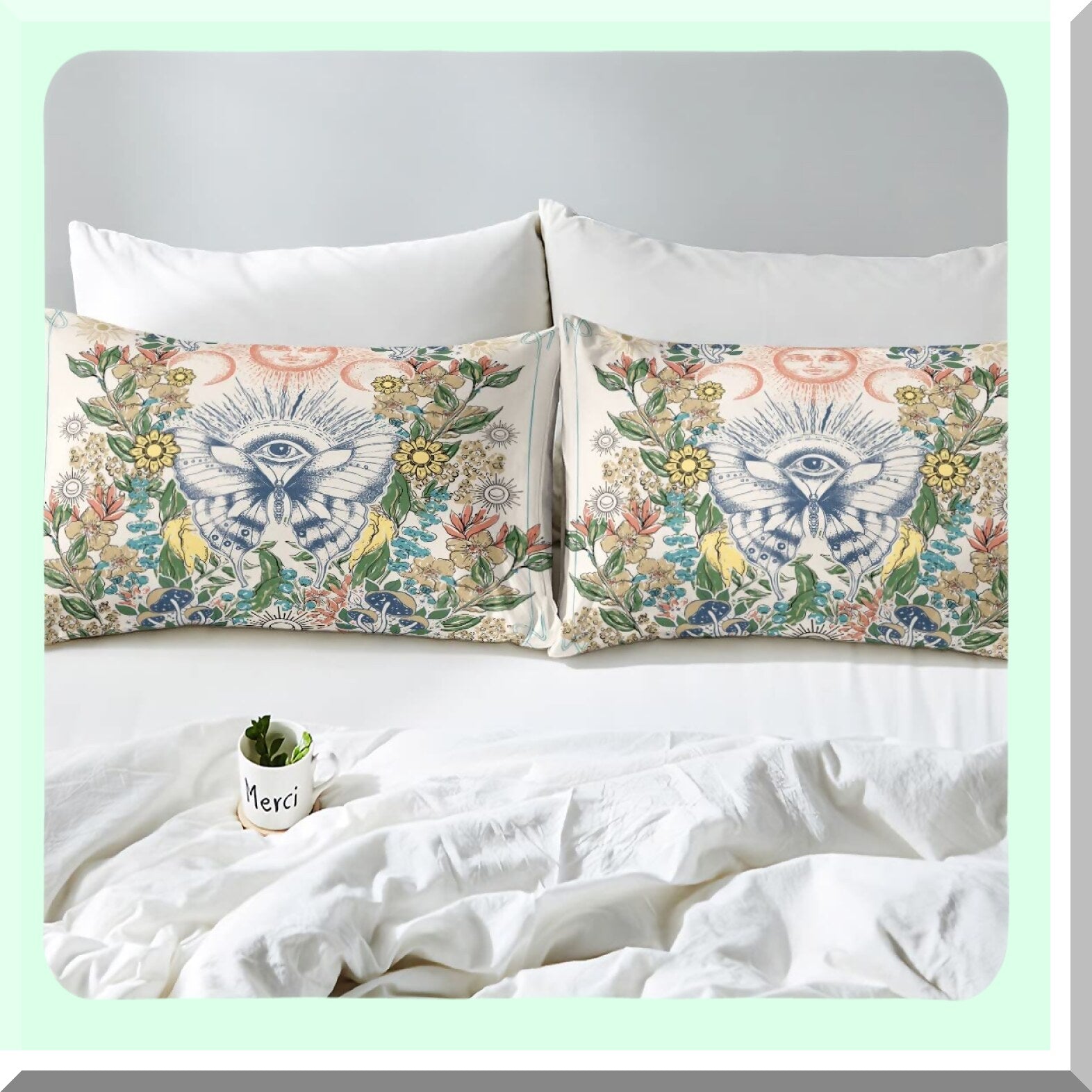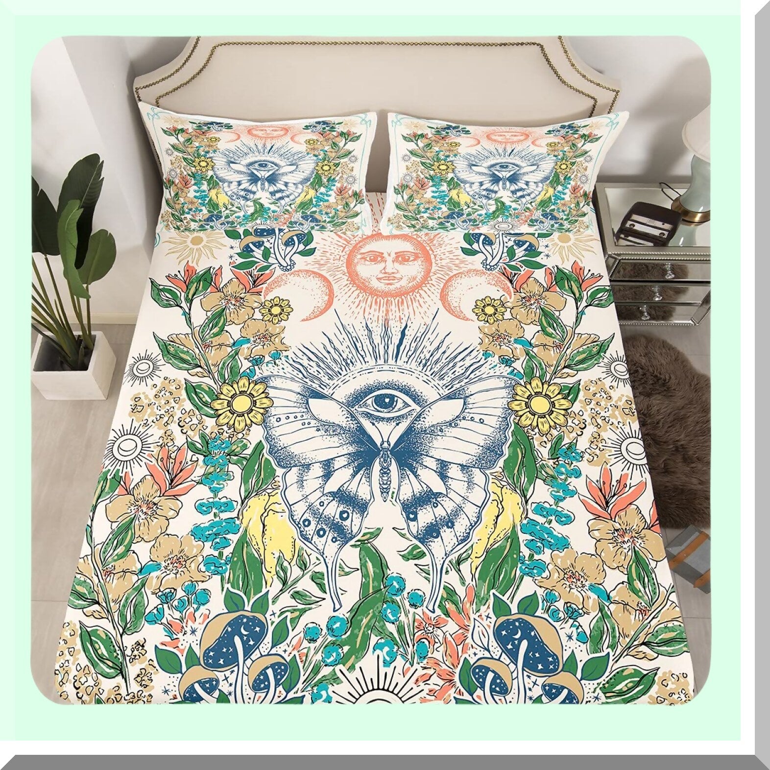 Retro Flower Power Fitted Sheet Set - Full Size Hippie Butterfly Bedding with Sun and Moon Design, Groovy Floral Print, Deep Pocket, 60s 70s Vintage Style