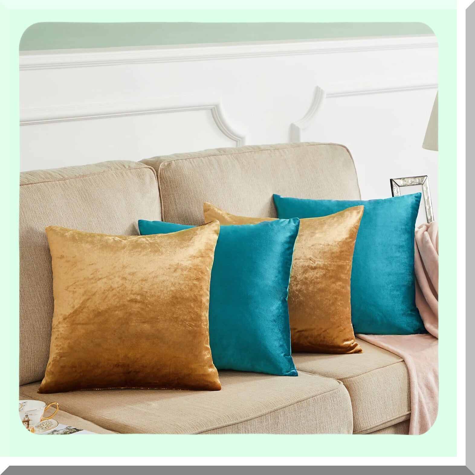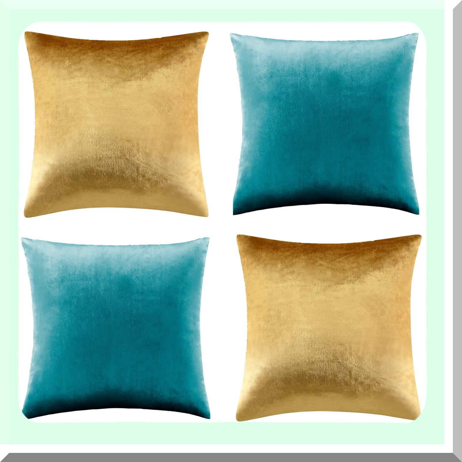 Luxury Velvet Gold Teal Pillow Covers - Set of 4 | Soft Square Cushion Covers 18 x 18 | Decorative Throw Pillowcases for Home Decor