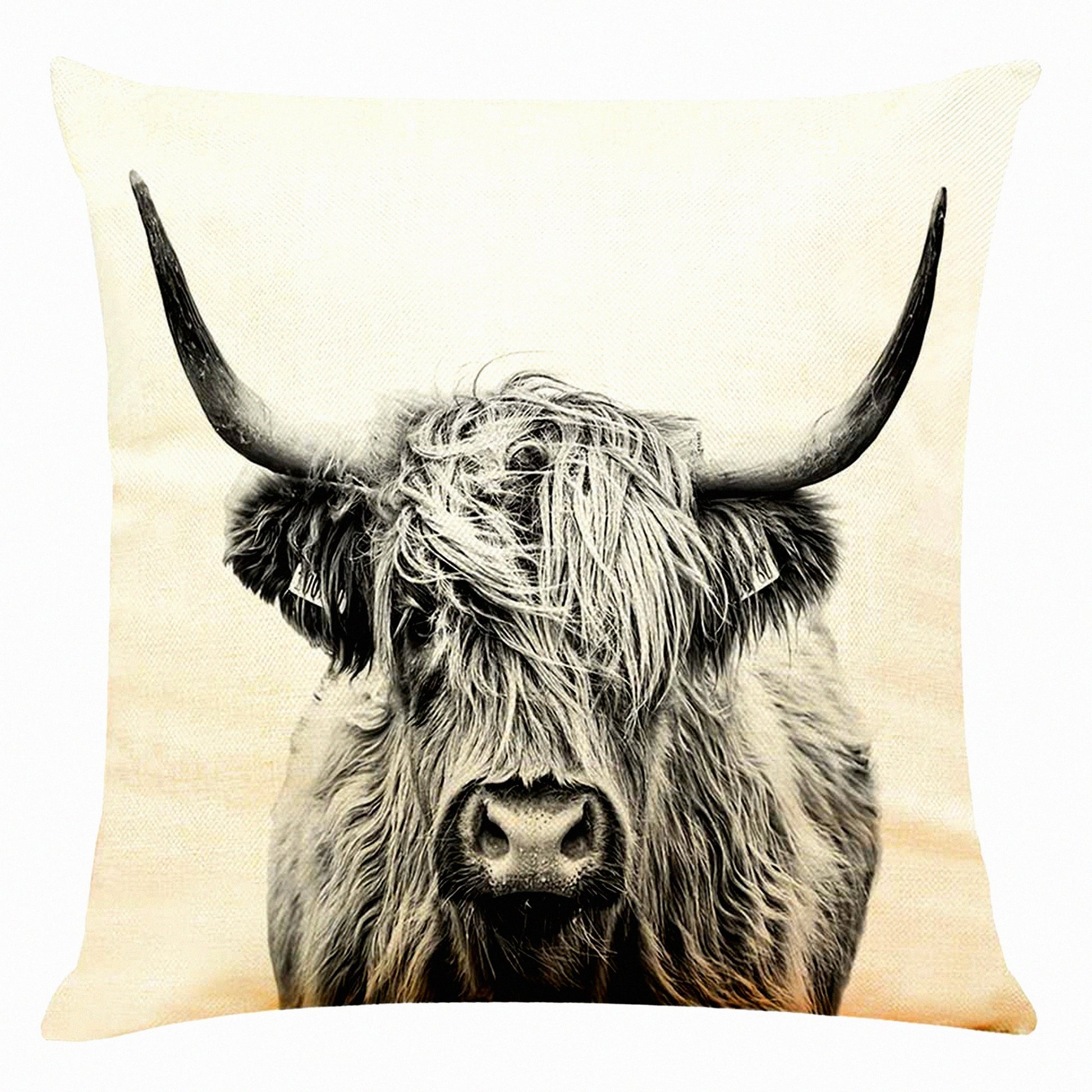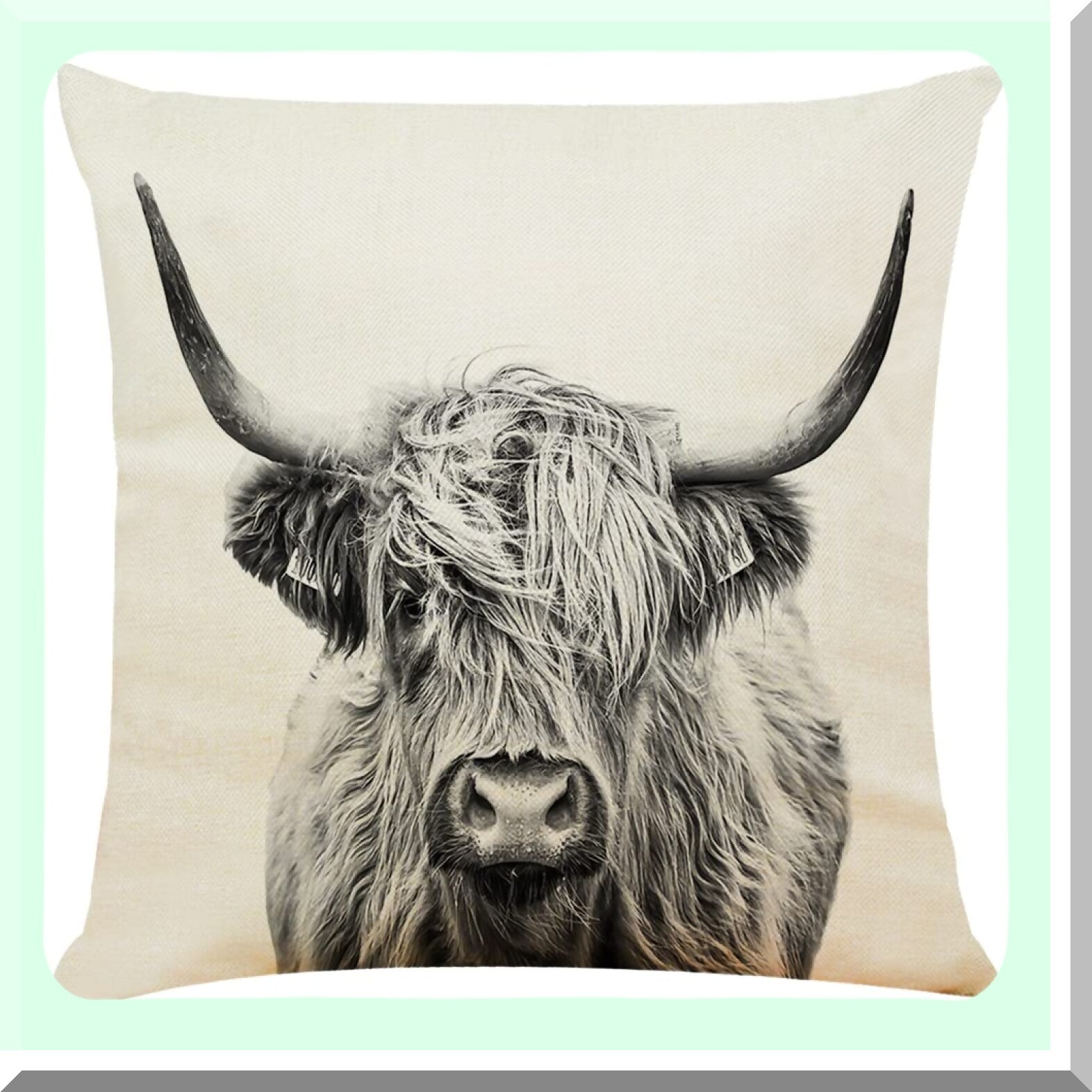 Highland Cow Linen Pillow Cover - 18x18 Inch Decorative Cushion for Couch, Sofa, Bed - Cow Home Decor - Farmhouse Style Throw Pillow Case