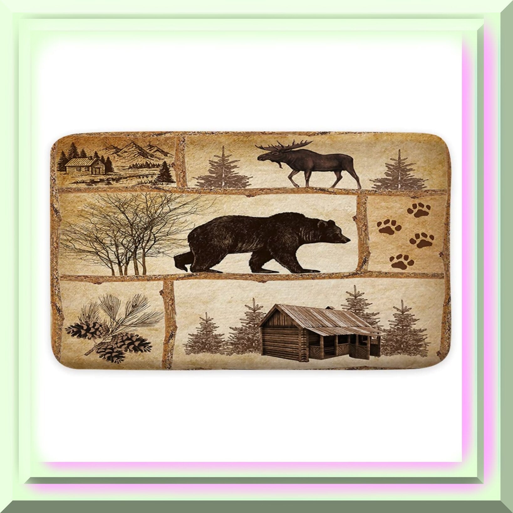 This Rustic Cabin Bath Rug measures 17x29 inches and features a vintage wood decor design inspired by farmhouse and country themes. The mat showcases antique bear, moose, and forest motifs, adding a rustic touch to any space. Its non-slip surface ensures safety on wet floors, making it suitable for bathrooms, bedrooms, kitchens, outdoor, and indoor areas. Crafted to soothe tired feet and protect toes from icy surfaces, this versatile bath rug enhances your decor while providing comfort. The design is carefully created to complement hunting, camping, and nature-inspired settings. Please note, the package includes one mat, with accessories not included. Manual measurement may result in a 1-2cm error. We are confident you will love this floor mat, and if you have any dissatisfaction or questions, a money-back guarantee is available. Elevate your space with this charming, functional bath rug.