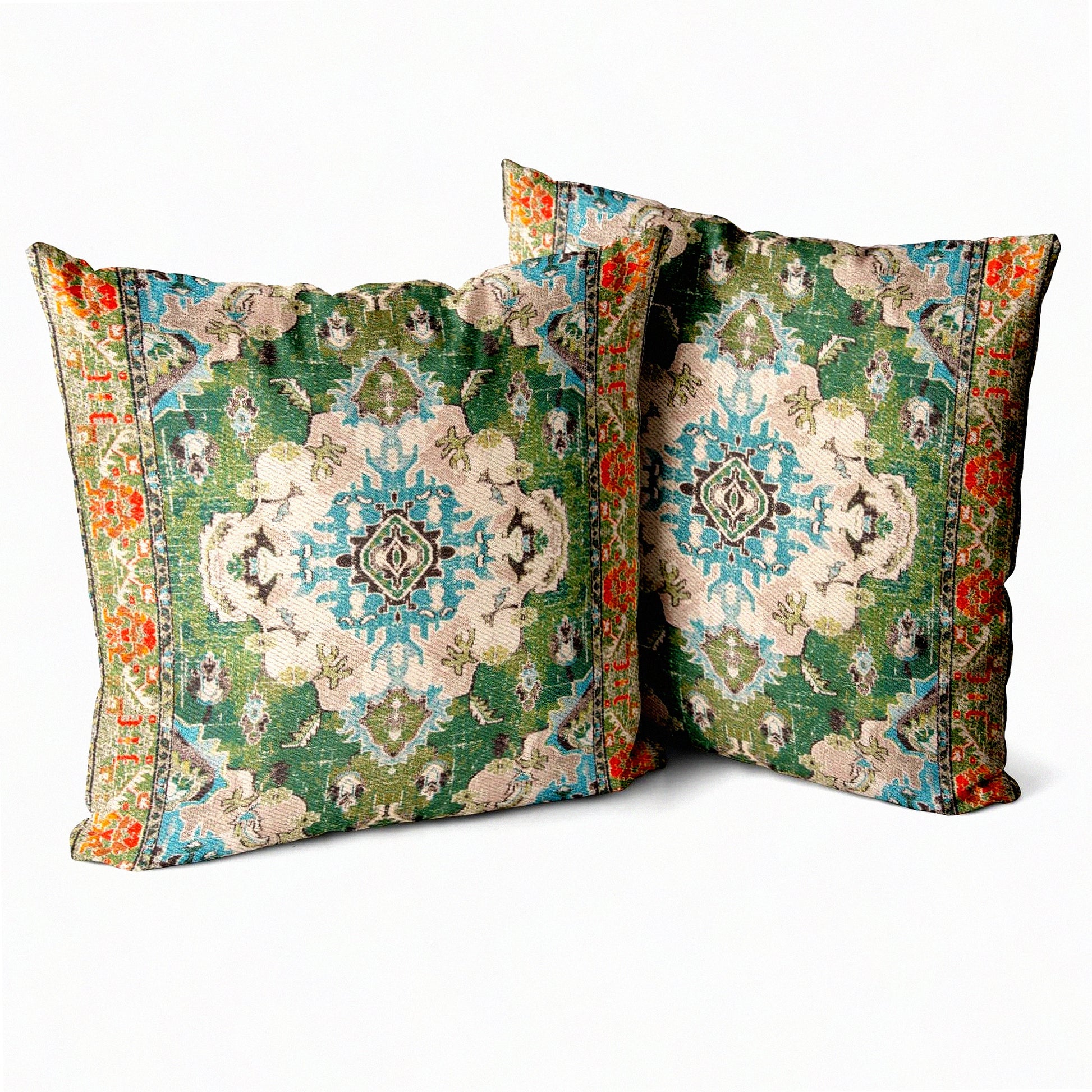Boho Persian Cotton Pillow Covers - Set of 2 Monaco Rug Cushion Cases 18x18 inch Double Sided Pattern for Couch Sofa Bed Decor - Soft Green Decorative Pillows