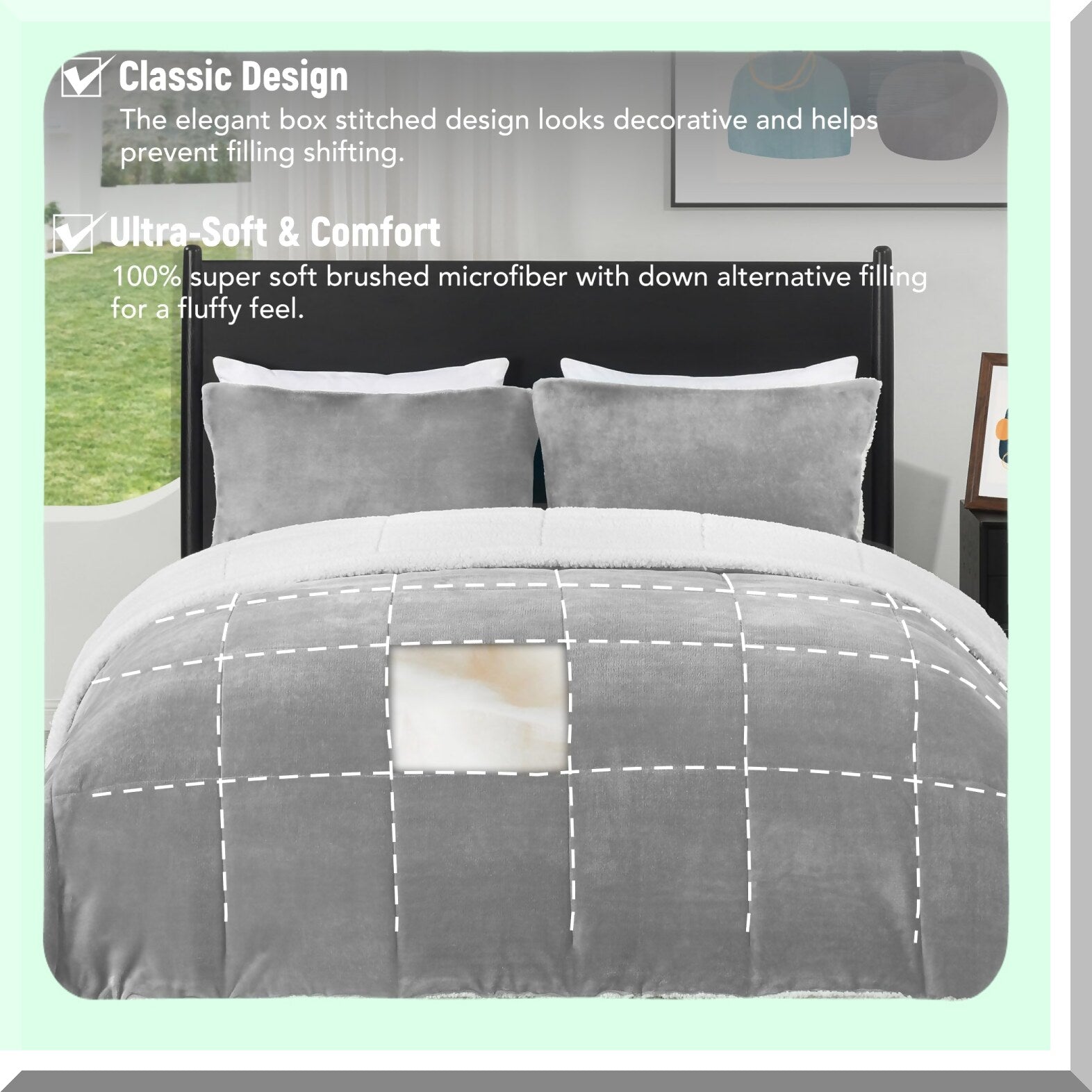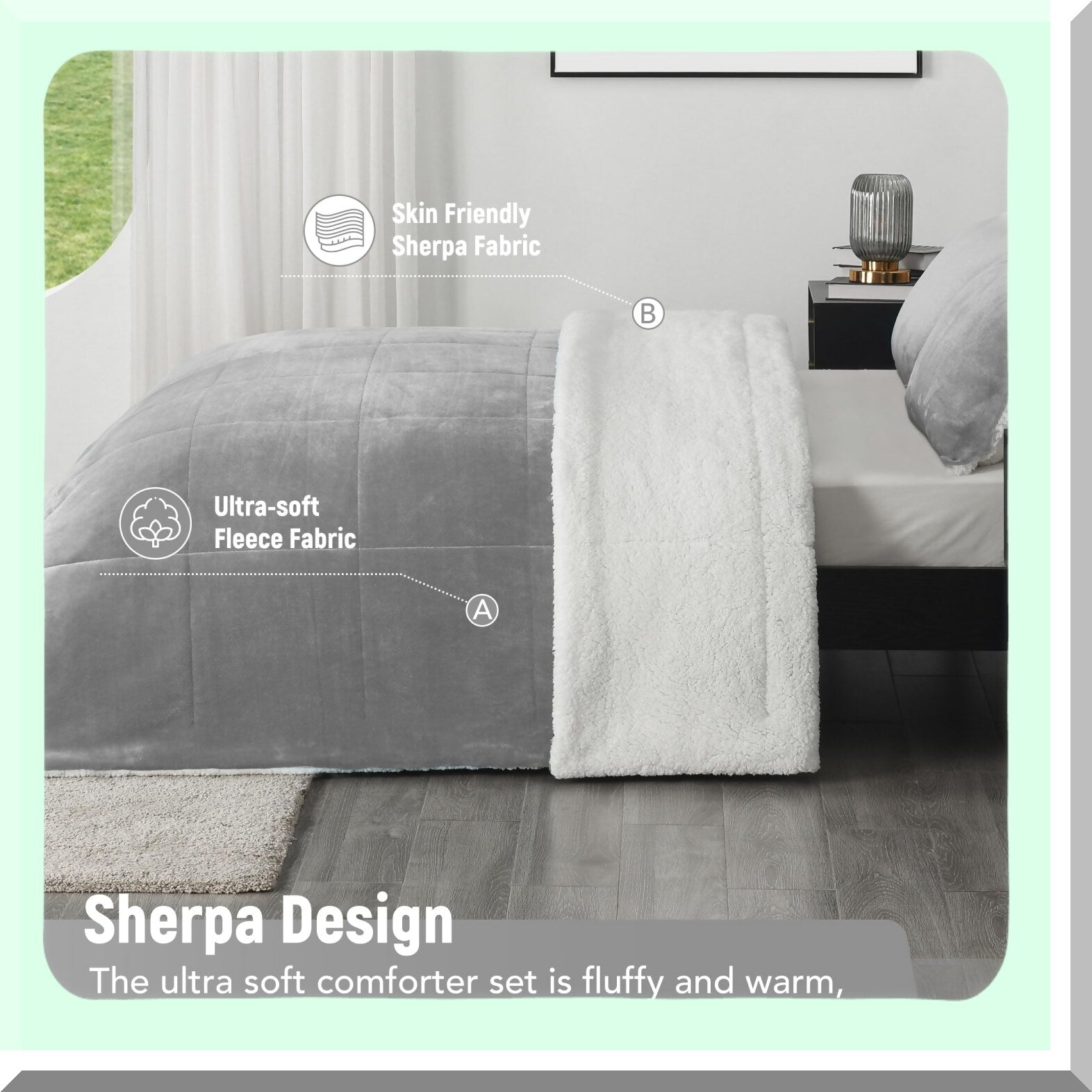 Indulge in luxurious comfort with our Ultra-Soft Micromink Sherpa Queen Comforter Set. This 3-piece set includes 2 pillow shams, all in a stylish light grey color. The plush Sherpa material is perfect for staying warm during the fall and winter months, making it an essential addition to your bedding collection. Experience the ultimate coziness and relaxation with this bedding set, perfect for upgrading your bedroom decor. Treat yourself to a restful night's sleep with our ultra-soft and warm comforter set.