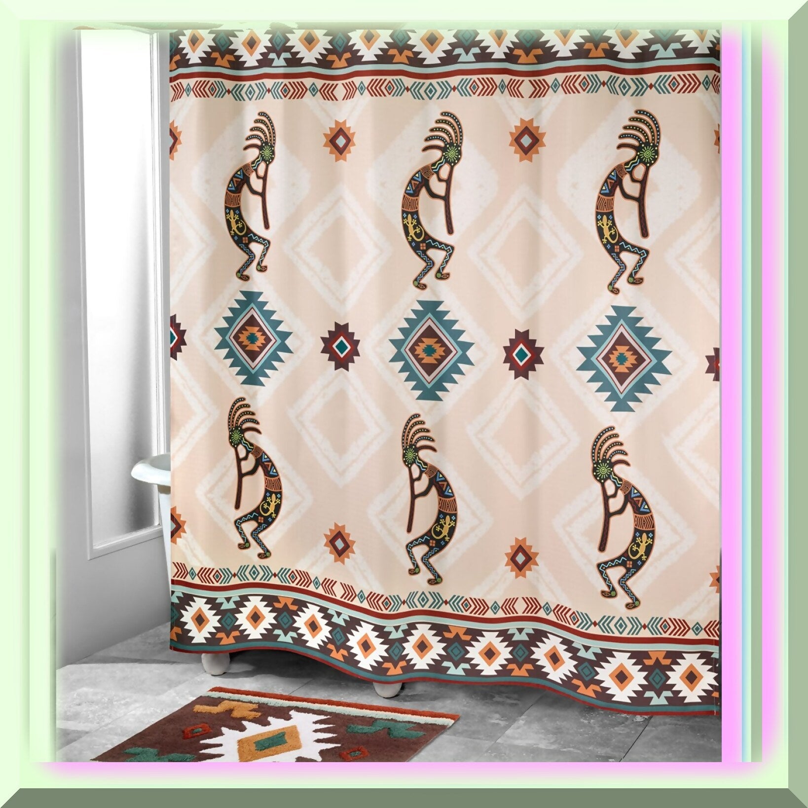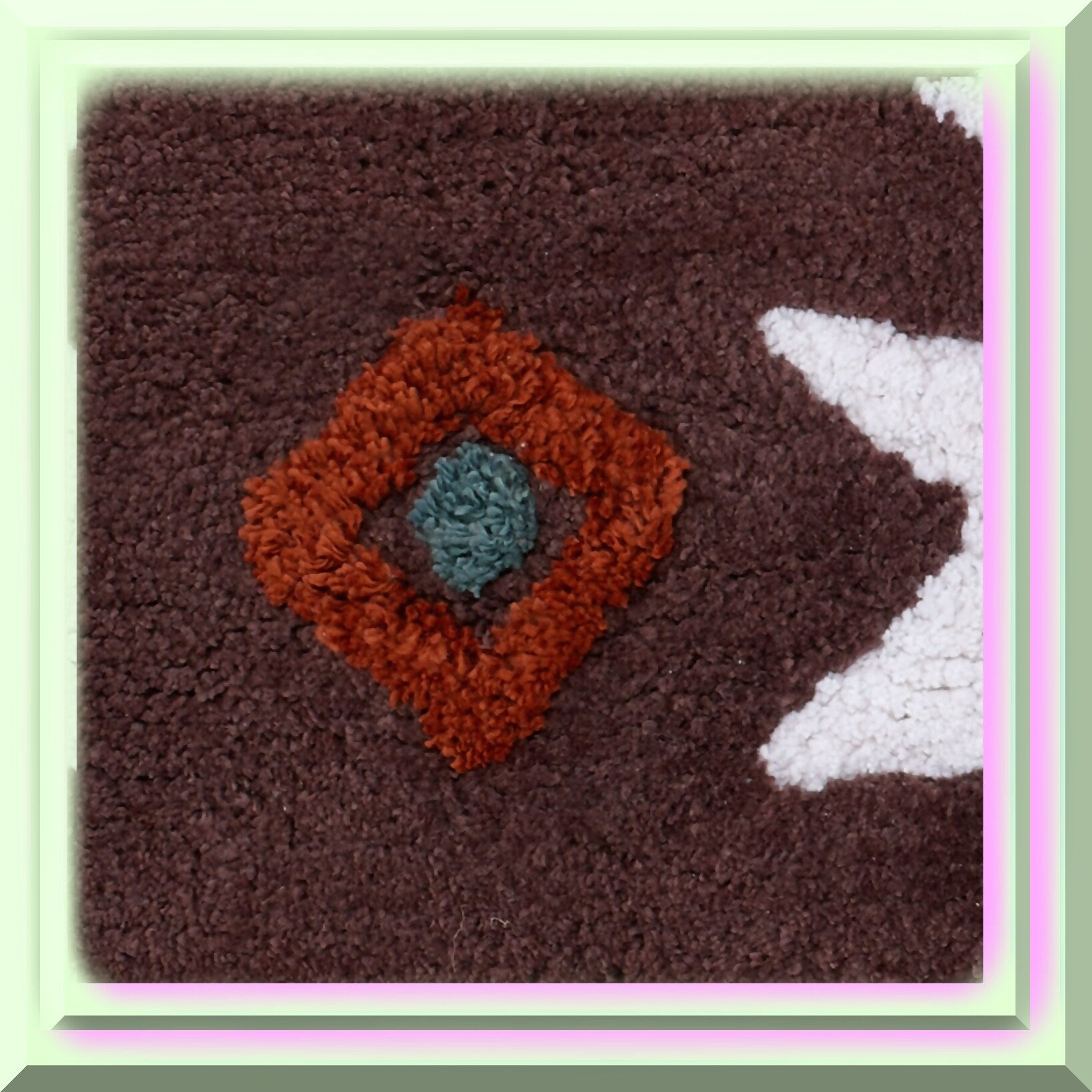 This cotton bath rug measures 20" x 30" and features an Aztec-inspired design with a large southwest symbol in the center, accented by elements in ivory, beige, teal, brick, and gold. The top and bottom borders are decorated with brick and light blue stripes, adding a vibrant touch to the overall pattern. Crafted from tufted 100% cotton, the rug offers luxurious softness underfoot. Its non-skid latex backing ensures safety and stability on bathroom floors. Perfect for adding a touch of Navajo-inspired decor to your bathroom, this bath mat combines comfort, style, and practicality in one piece.