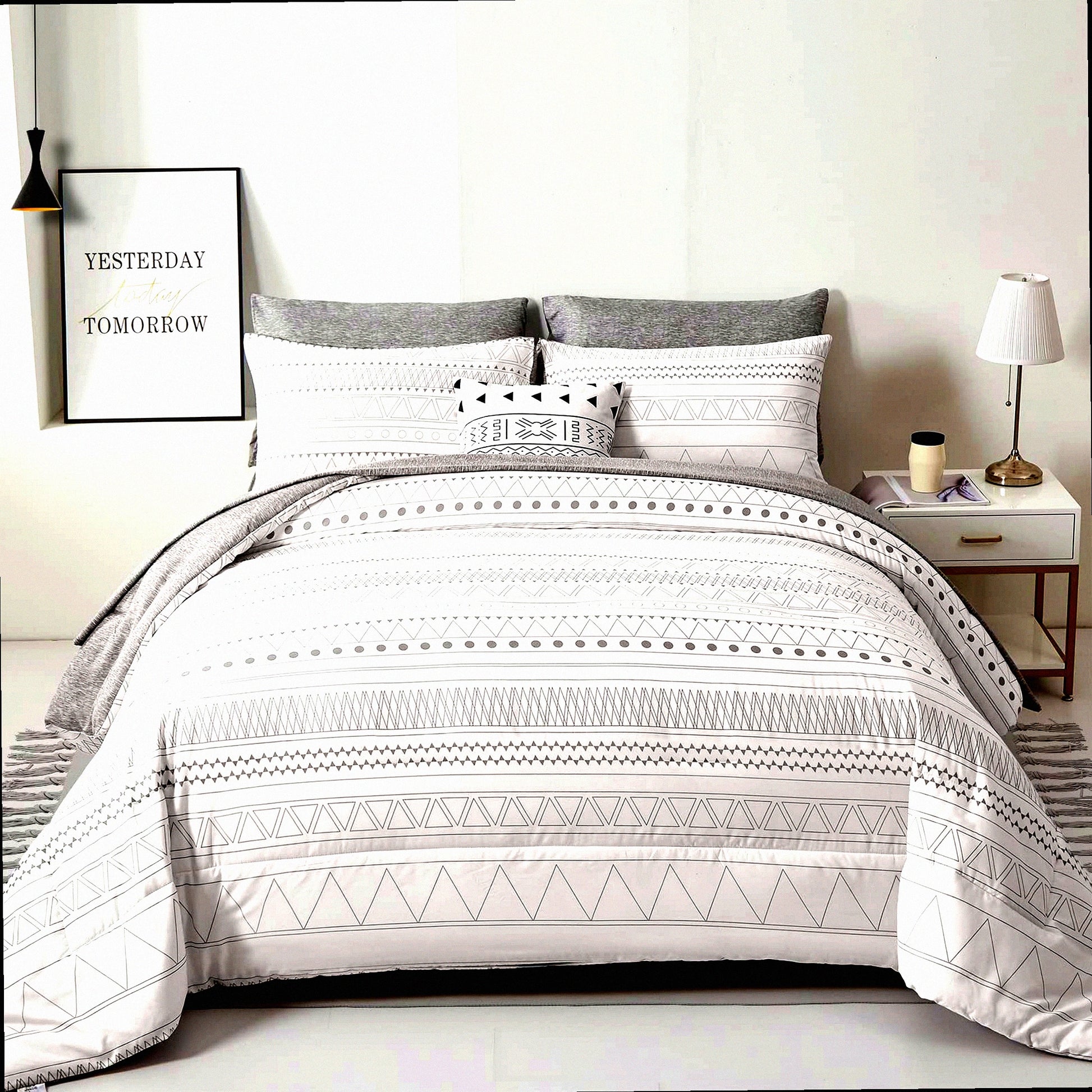 Geometric Boho Chic 7-Piece Comforter Set - Grey White Striped Bedding Bundle with Sheets, Pillowcases, Shams - Soft Microfiber - All Season Comfort