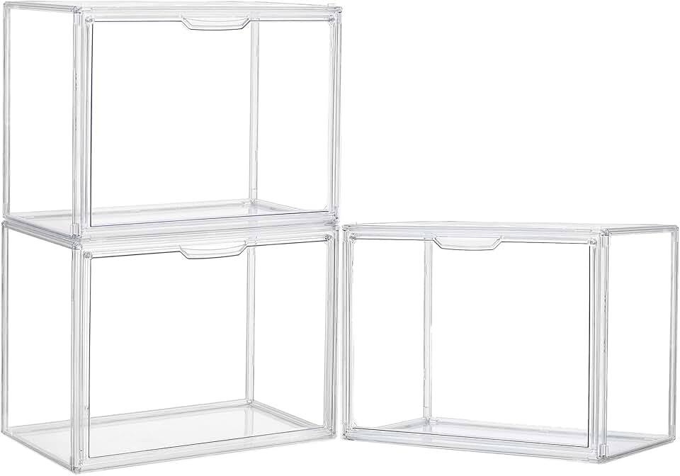 This set includes three clear acrylic display cases designed for organizing and showcasing collectibles, figures, and other items. Each box features a magnetic door for easy access and secure closure. The transparent construction allows for clear visibility of contents, making it ideal for displaying collectibles or storing small items. The stackable design helps maximize space and keep items organized. These large storage bins are suitable for use as display cases or storage solutions in various settings. The sturdy acrylic material ensures durability and a sleek appearance. The included lids help protect items from dust and damage while maintaining a tidy presentation. Perfect for collectors or anyone looking to organize their space efficiently, these acrylic boxes combine practicality with a clean, modern look. They are easy to clean and maintain, making them a versatile addition to any home or office.