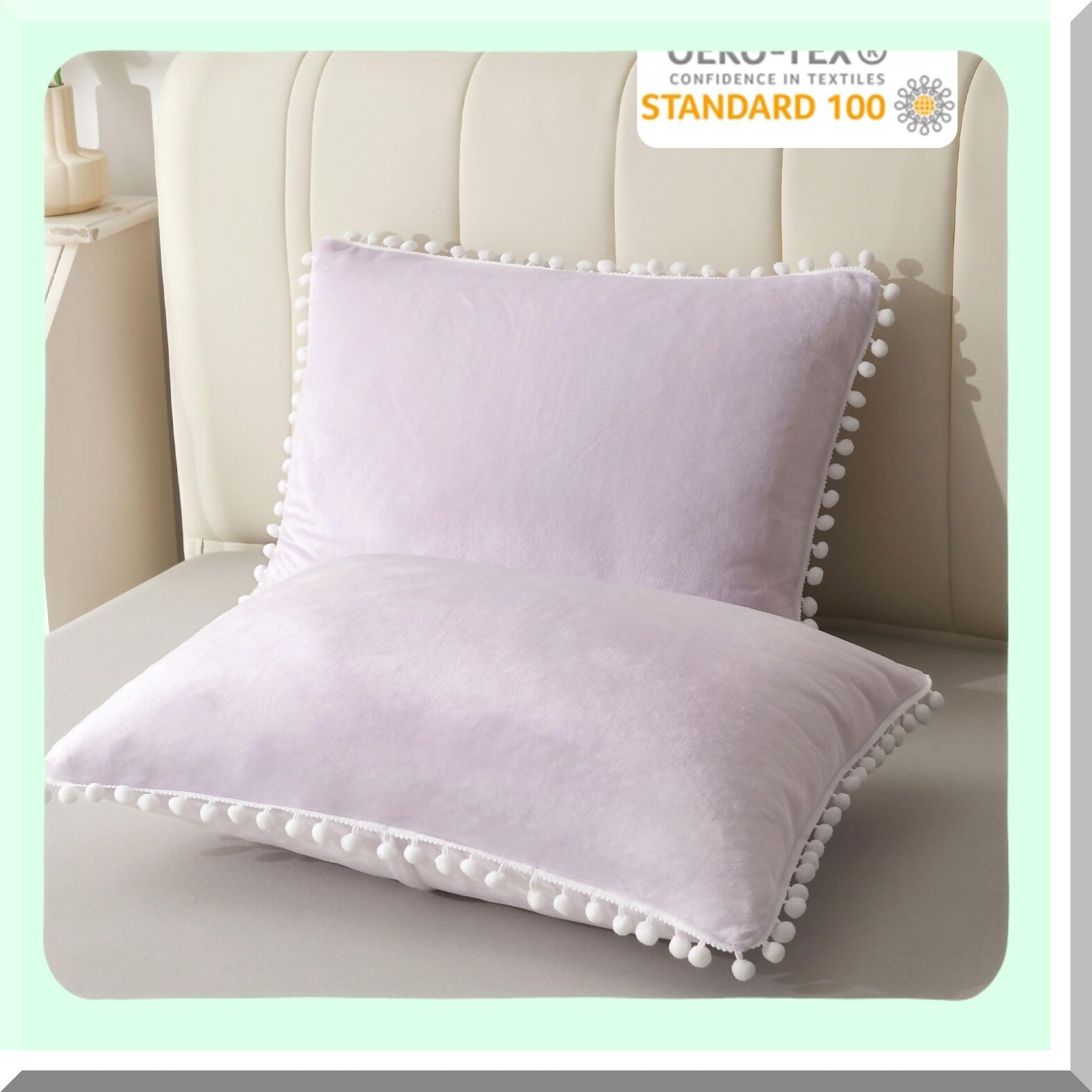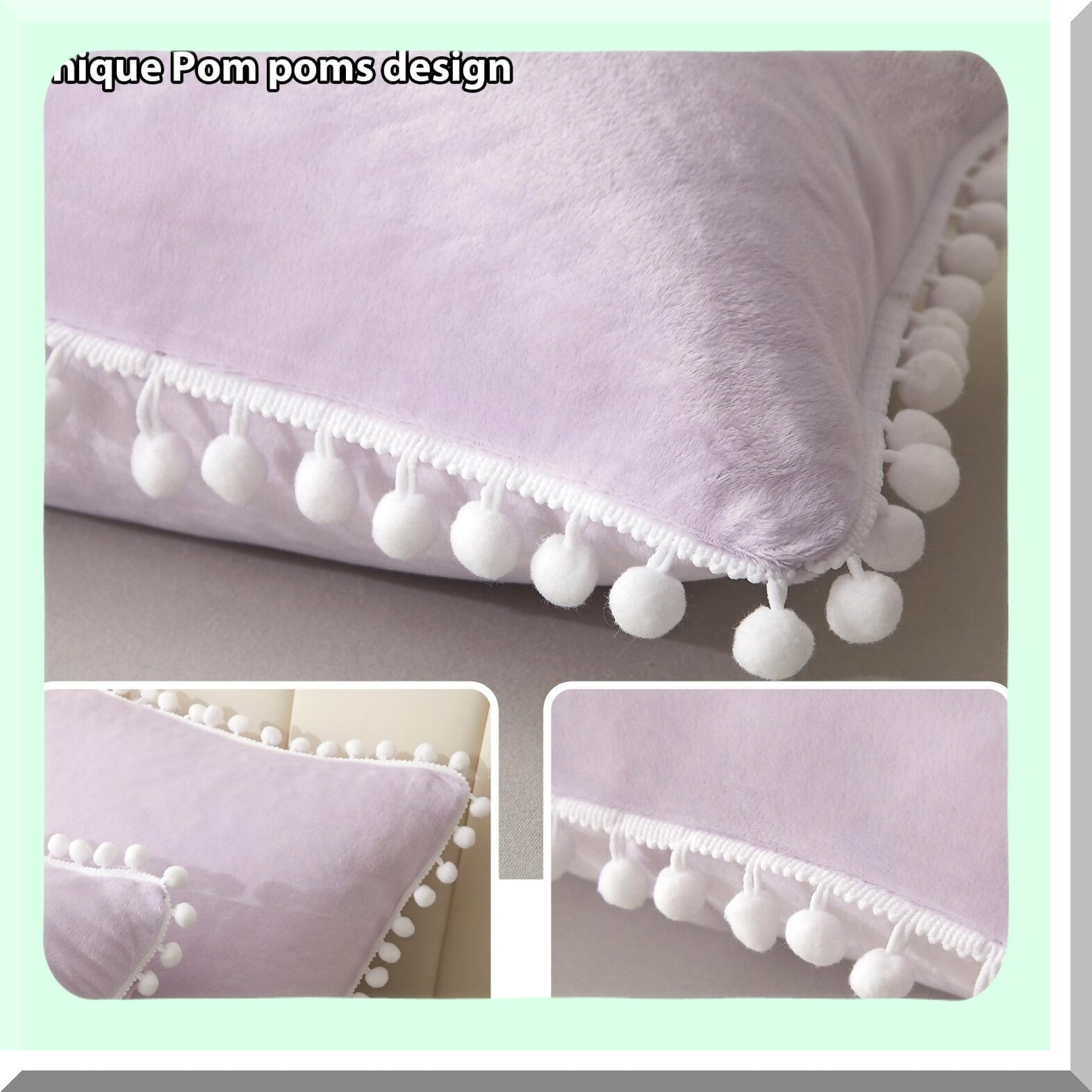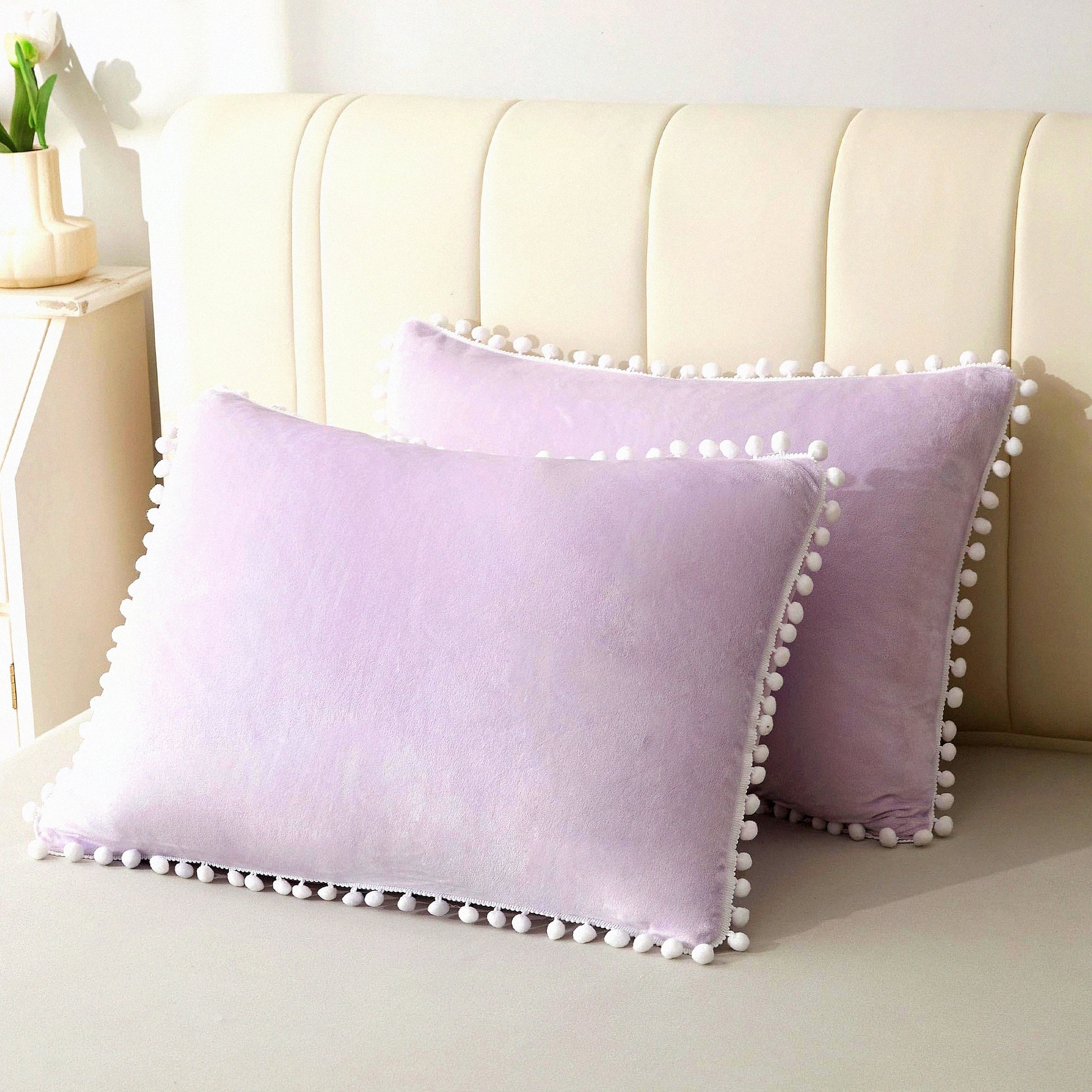 Lavender Velvet Fringe Pillowcase Set - Soft Pom Pom Decorative Throw Shams for Girls, Teens, Women - Zippered Bed Pillow Covers - Standard Size