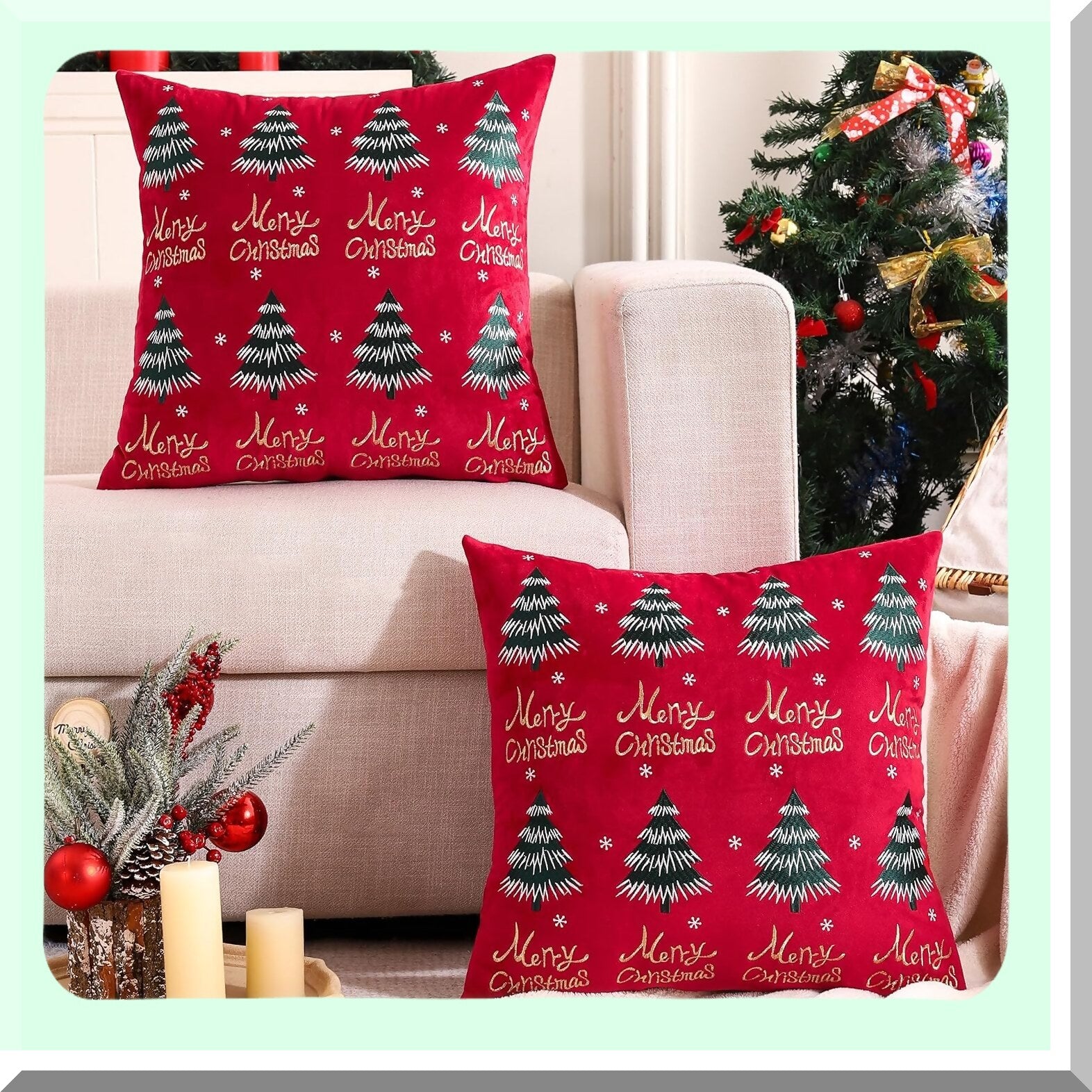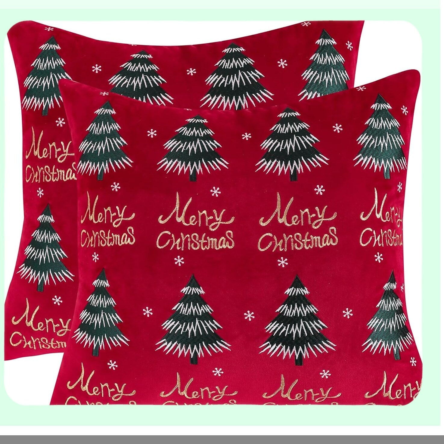 Velvet Merry Tree Holiday Pillow Covers - Set of 2 Red Winter Party Decorations, 12 x 20 inch Cushion Cases