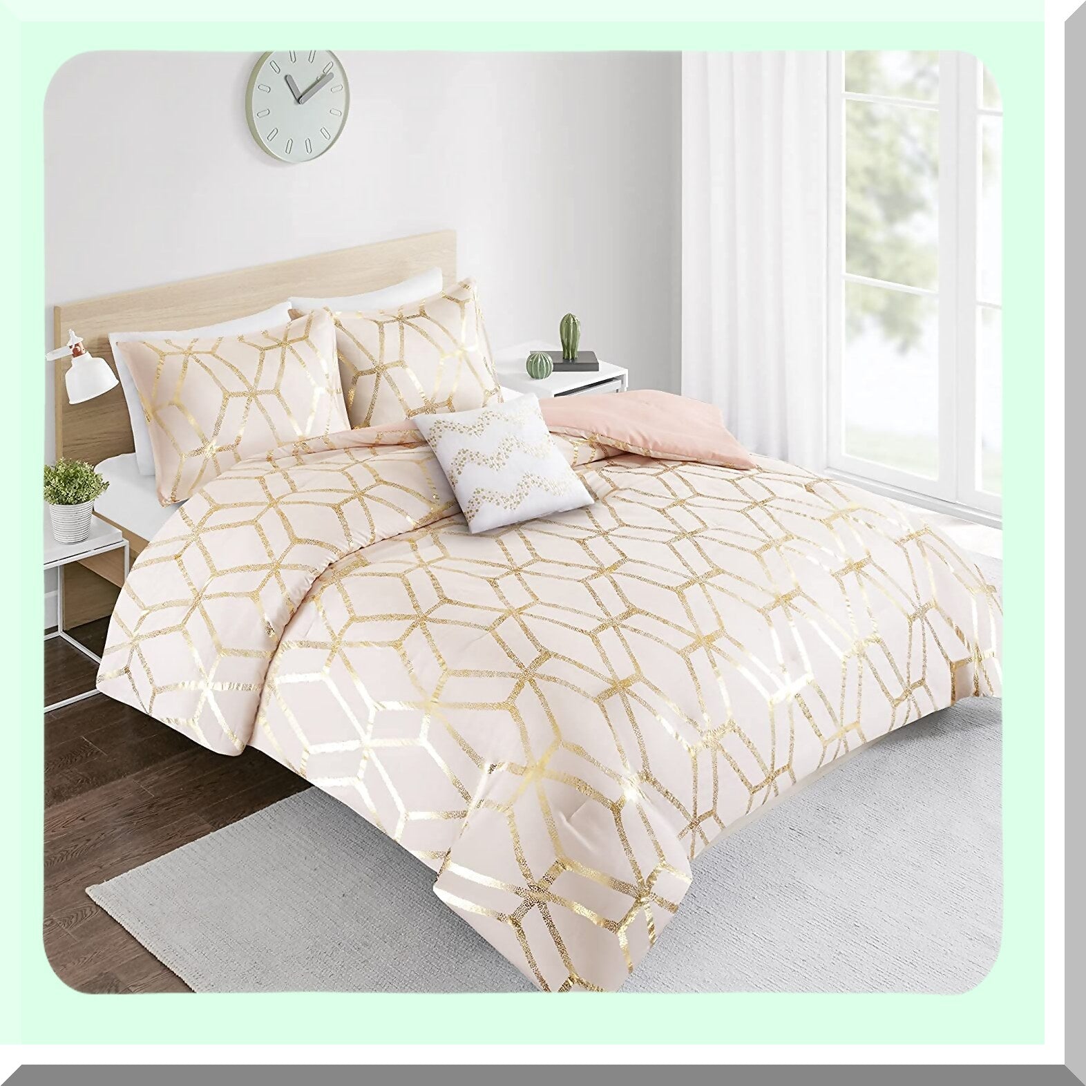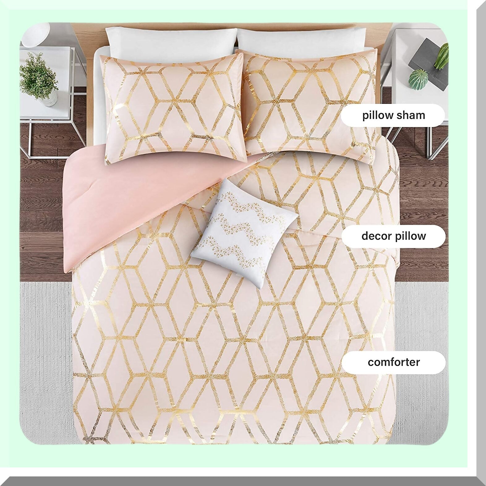 Glam Geometric Comforter Set - Ultra Soft Lightweight Bedding with Metallic Print, Matching Sham & Decorative Pillow for Full/Queen Size Bed, Modern Blush/Gold Theme