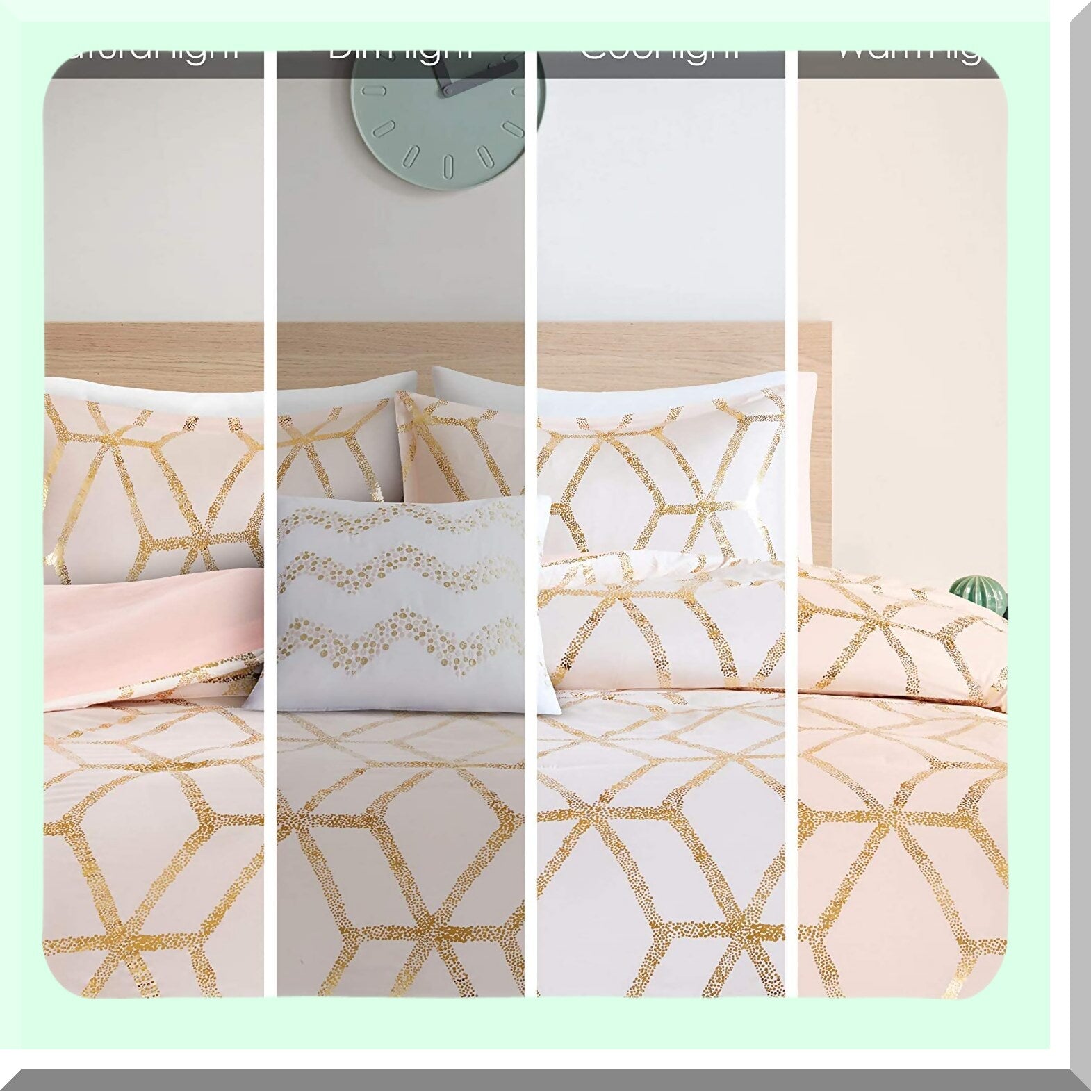 Introducing a luxurious comforter set that combines style and comfort effortlessly. The trendy design features a stunning gold metallic geometric print on one side, with a solid blush pink reverse for a versatile look. The matching shams complete the set for a cohesive bedroom aesthetic. Crafted from ultra soft microfiber, this set offers a cozy feel perfect for all year round use. The lightweight hypoallergenic filling ensures a comfortable night's sleep, while the unique color and print add a touch of sophistication to any bedroom decor. Upgrade your bedding with this chic and practical comforter set today!