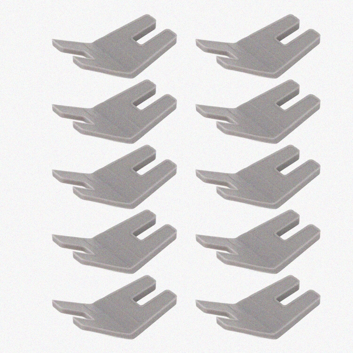 This set includes 10 hump jumper presser feet, designed for household sewing tasks. Made from durable plastic, these small and compact tools are easy to store and handle. They are suitable for use with most sewing machines and are ideal for balancing the height of the presser foot when sewing heavier seams. The presser feet are used between fabric and buttons, making them versatile for various sewing projects. Each piece is lightweight and durable, ensuring reliable performance during sewing tasks. The set provides enough units to meet daily sewing needs, whether for home repairs or creative projects. Their compact design allows for convenient storage without taking up much space. These presser feet are a practical addition to any sewing toolkit, offering functionality and ease of use for a variety of sewing applications.