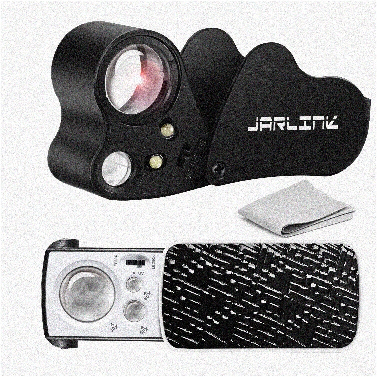 The GemGlow 2-in-1 Jewelers Loupe Set offers versatile magnification options for detailed examination of gems, jewelry, coins, stamps, and more. The set includes a 30X, 60X, and 90X magnifier with lens diameters of 20mm, 10mm, 8mm, 12mm, and 25mm, allowing you to explore intricate details with clarity. Designed for precision, it features accessories such as an iron sheet for stability, a key for portability, and a soft cloth for cleaning. The package also contains six LR1130 and six LR44 button batteries, a user manual, and a storage cloth bag. Whether you're a collector, professional, or enthusiast, this set provides multiple magnification levels to suit various needs. The inclusion of UV black light and LED enhances inspection capabilities, making it ideal for examining gemstones, jewelry, diamonds, coins, and stamps. Discover a world of detailed exploration with this comprehensive magnifier set.
