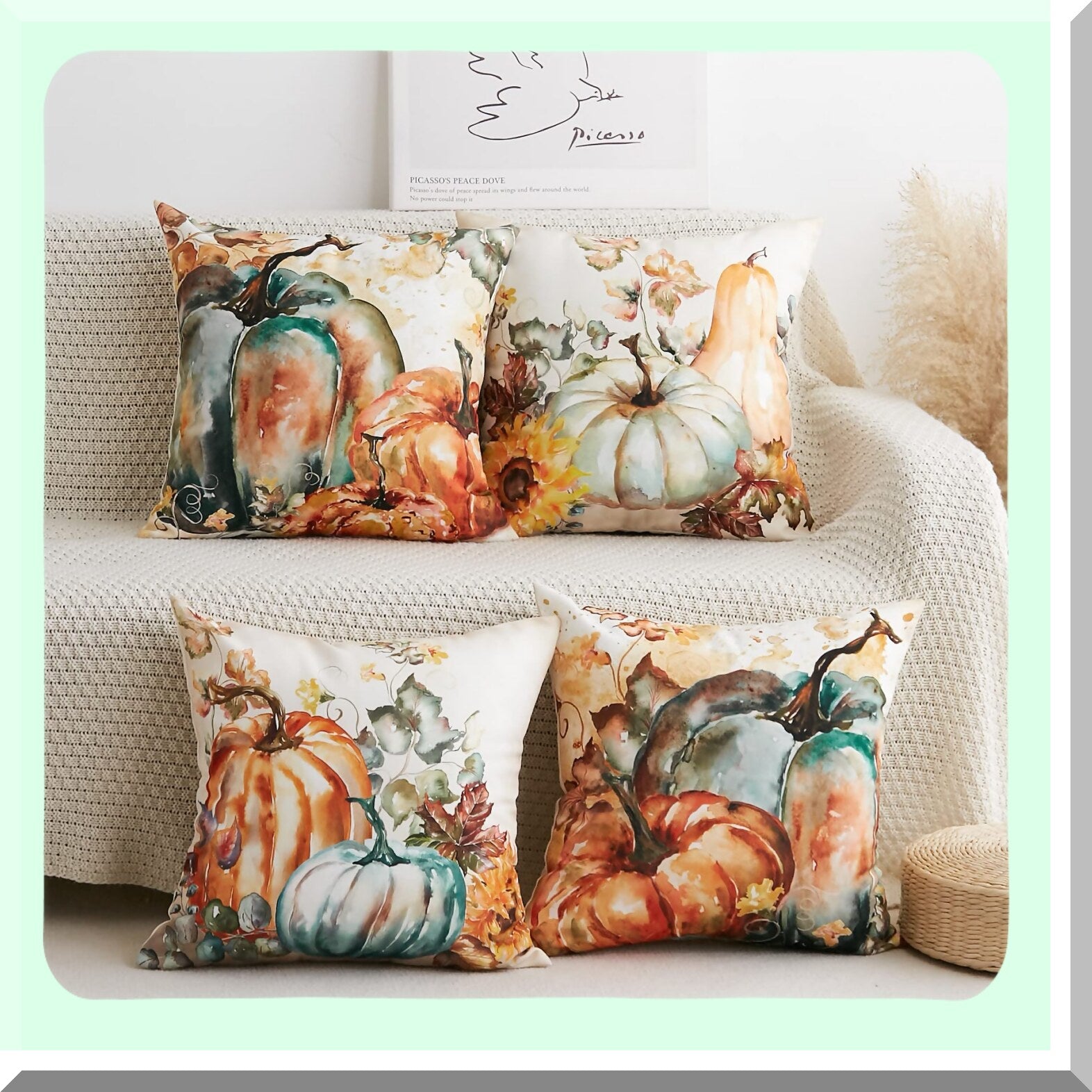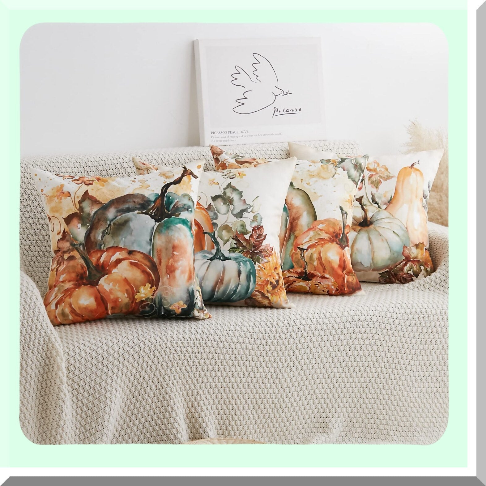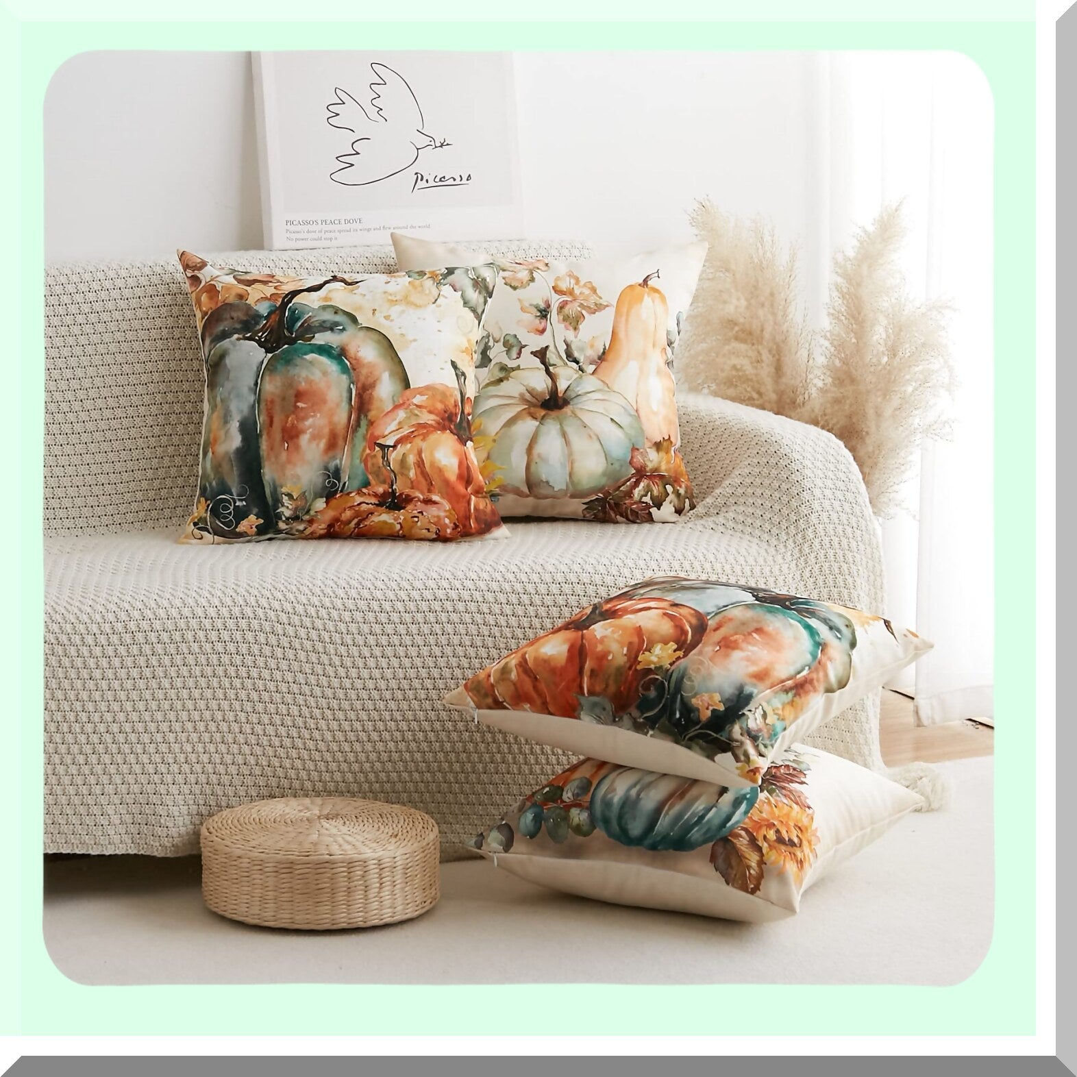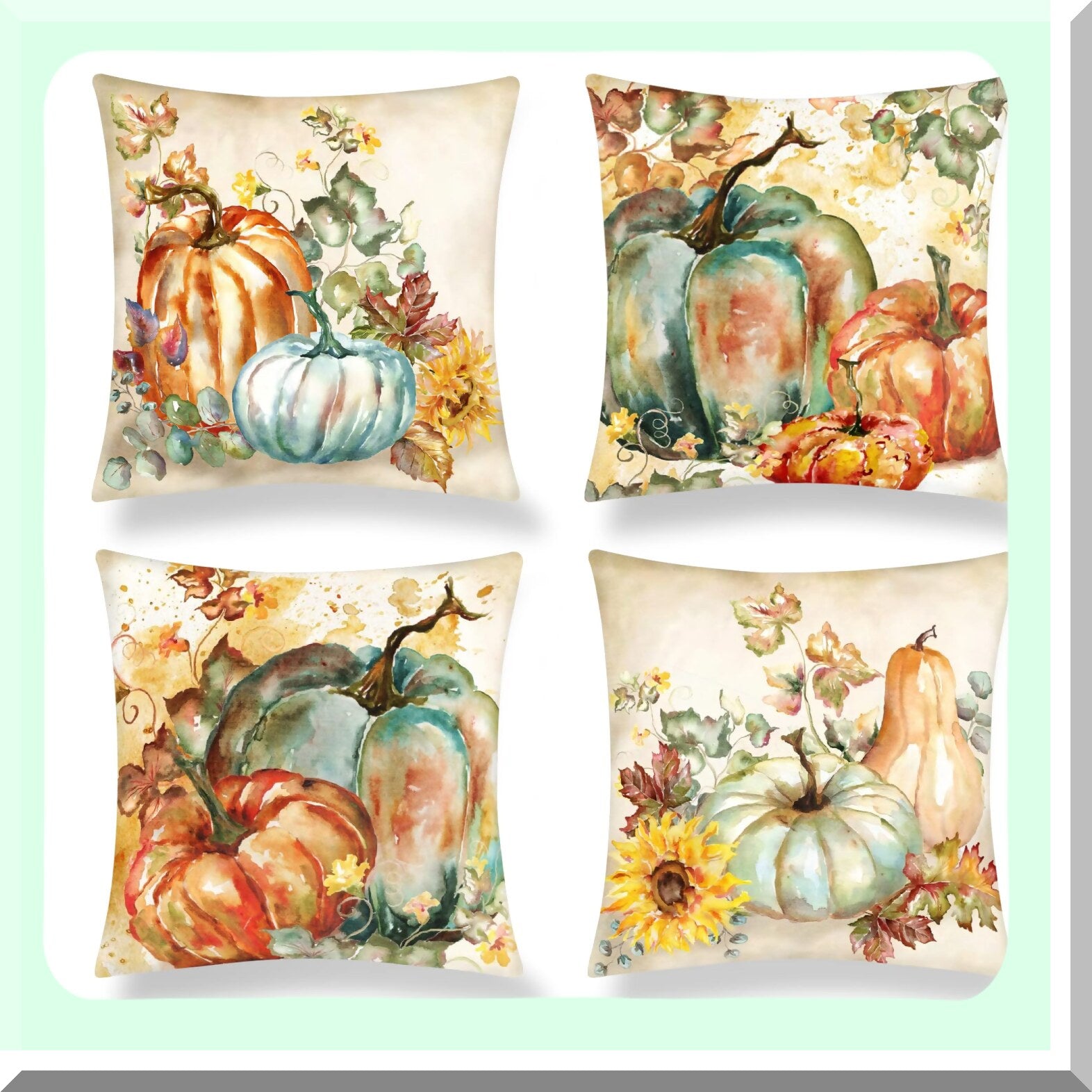 Autumn Harvest Pillow Cover Set - 18x18 Inch Pumpkin Sofa Pillowcase Farmhouse Square Couch Cushion Covers - Thanksgiving Watercolor Home Decor for Bedroom & Living Room - Fall Throw Pillows