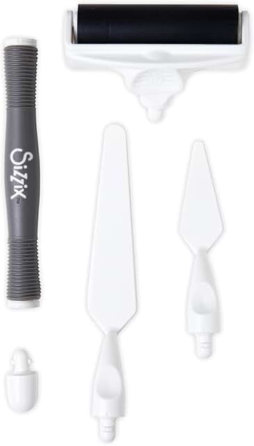 This set includes a palette knife and brayer roller designed for use with pastes, paints, oils, acrylics, and other mediums. The palette knife is suitable for mixing, spreading, and applying various substances, while the brayer roller helps create smooth, even surfaces and textured effects. Both tools are crafted for durability and ease of use, making them ideal for a variety of craft and art projects. The set features a white and grey color scheme.