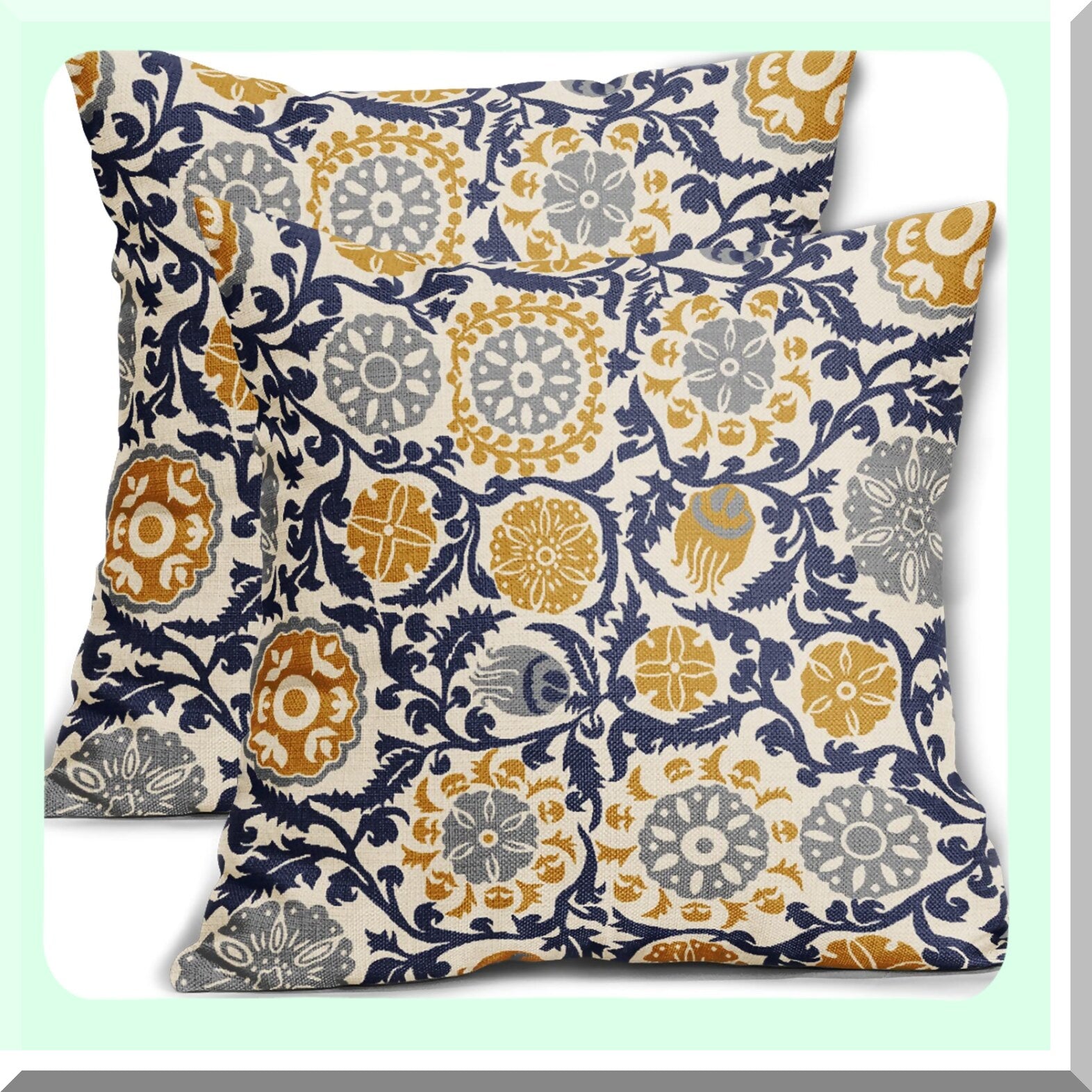 Boho Farmhouse Floral Pillow Covers Set - Navy Blue Yellow Grey 18x18 Rustic Decorative Throw Pillows - Vintage Square Linen Cushion Case for Sofa Bed