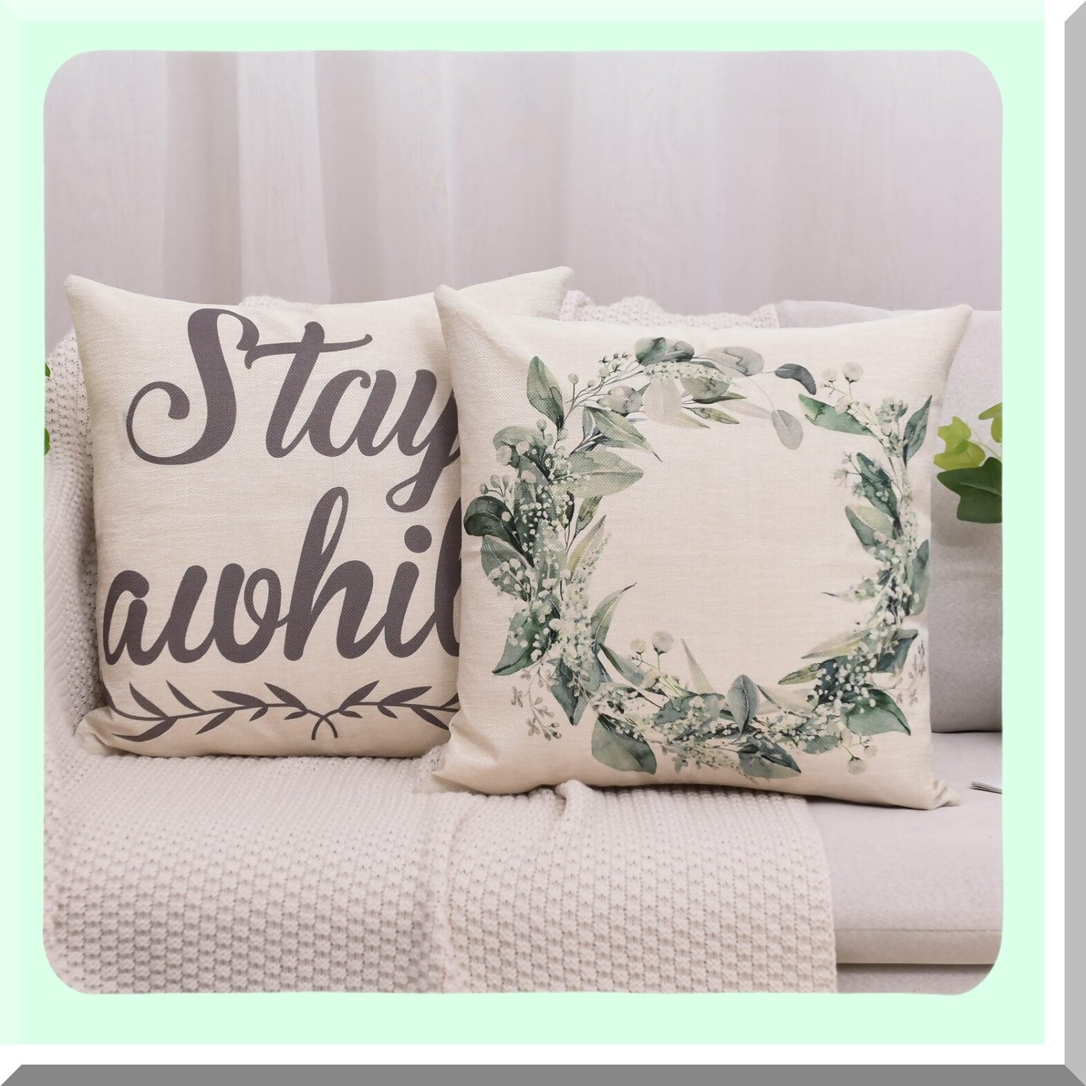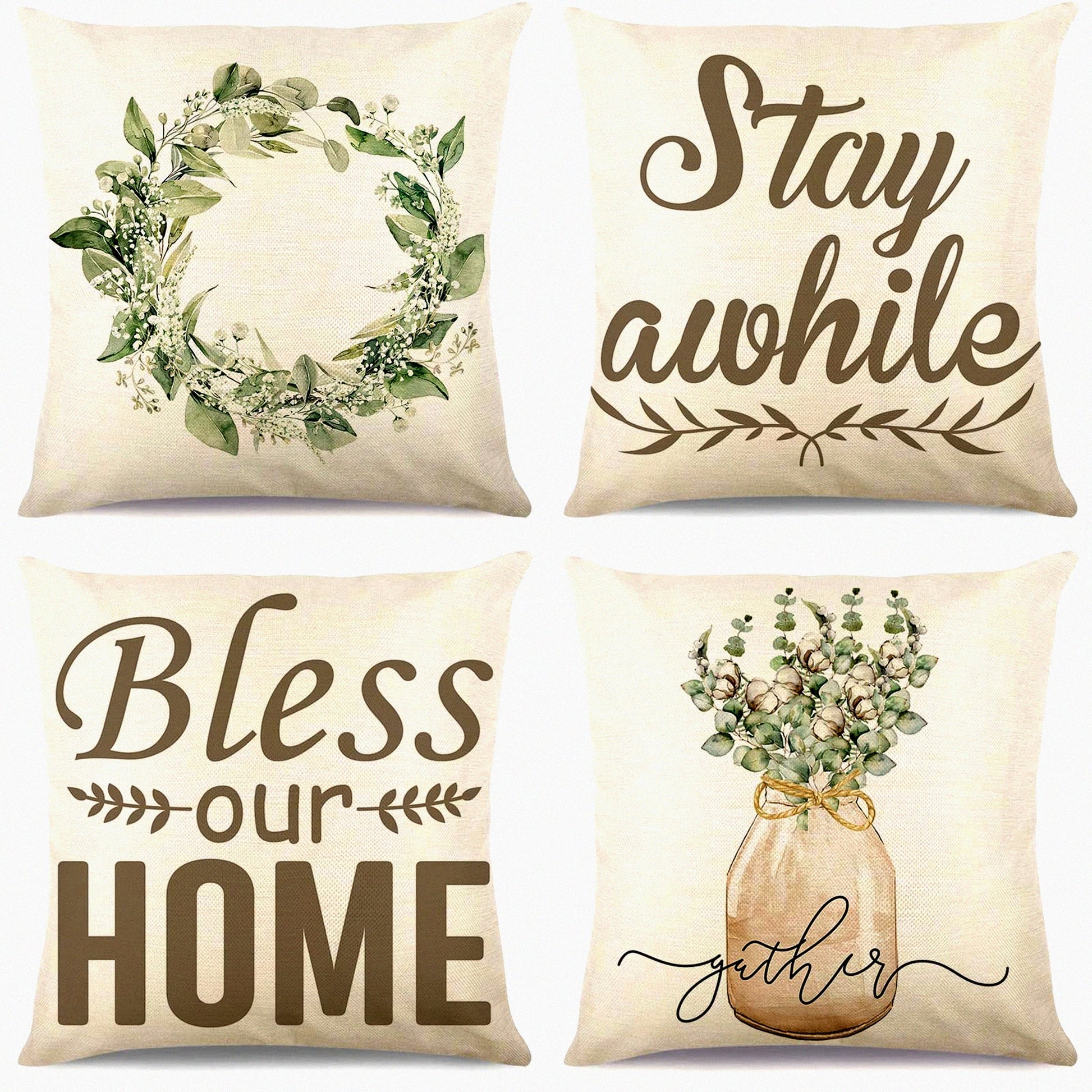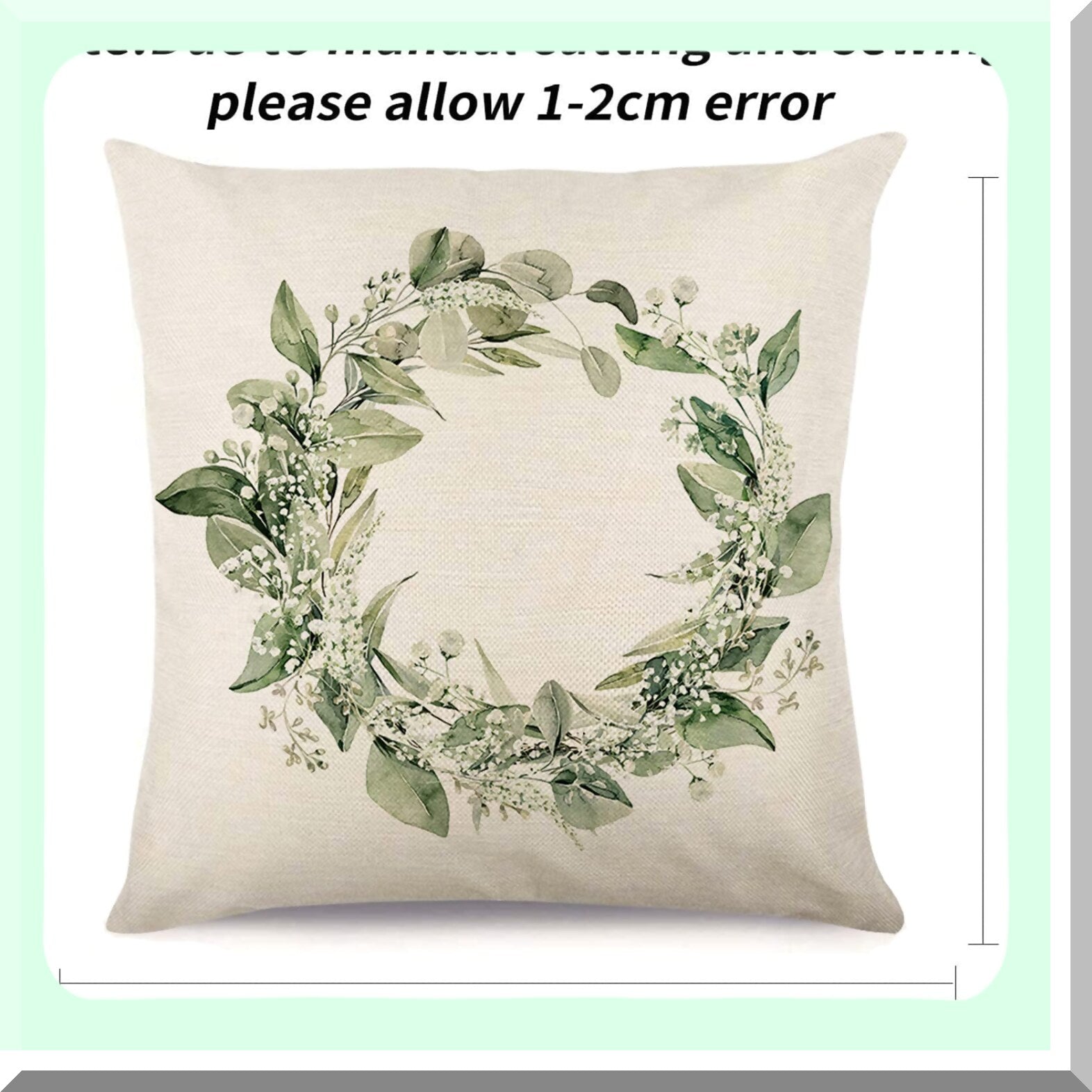 Spring Blessings Floral Pillow Covers - Set of 4, Farmhouse Decor Linen Cushion Cases for Sofa, Chair, Car - 18 x 18 Inches, Green/Wreath
