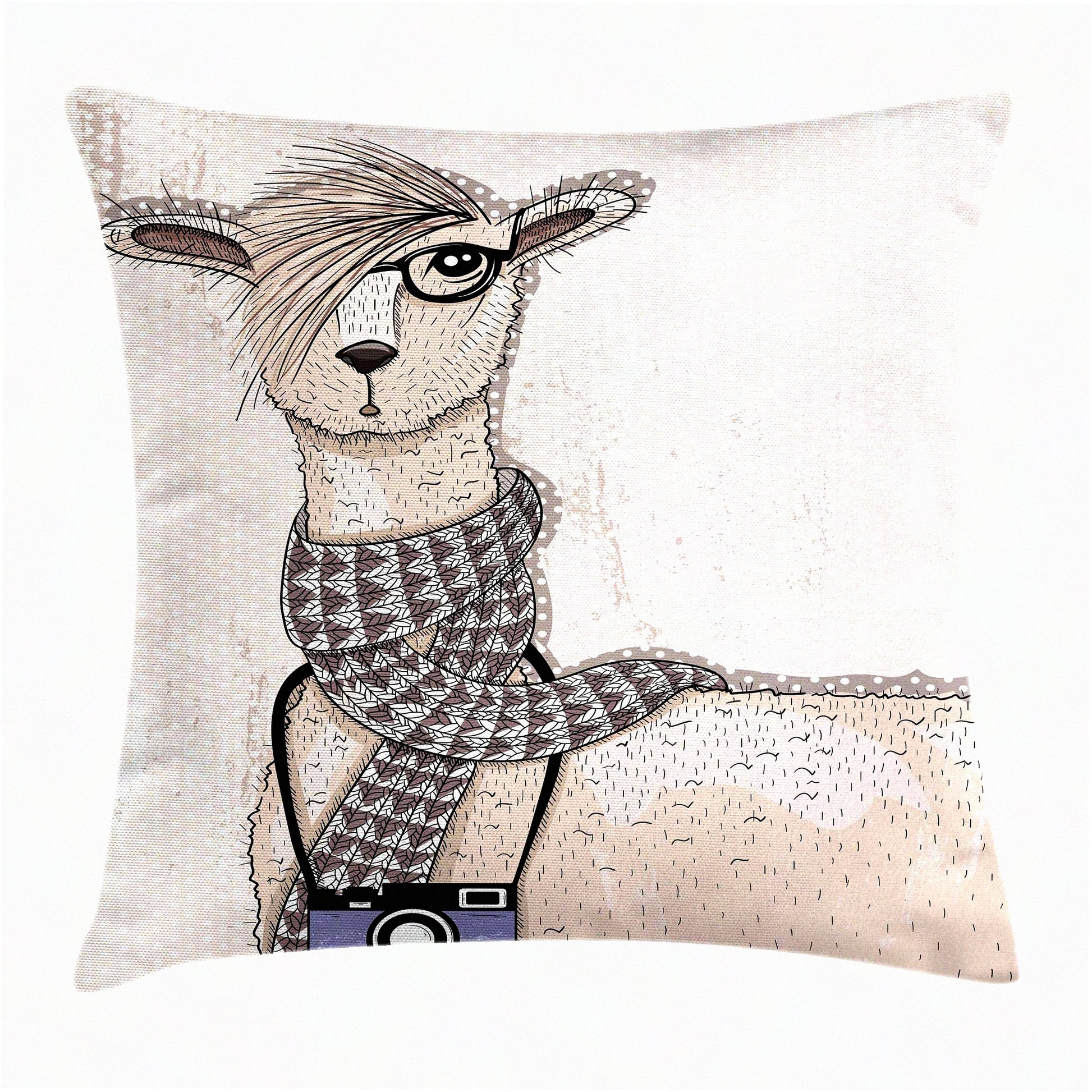 Hipster Llama Dotted Beige Pillow Cover - Decorative Animal Throw Cushion Case, 18" X 18" Ivory Charcoal Accent Square