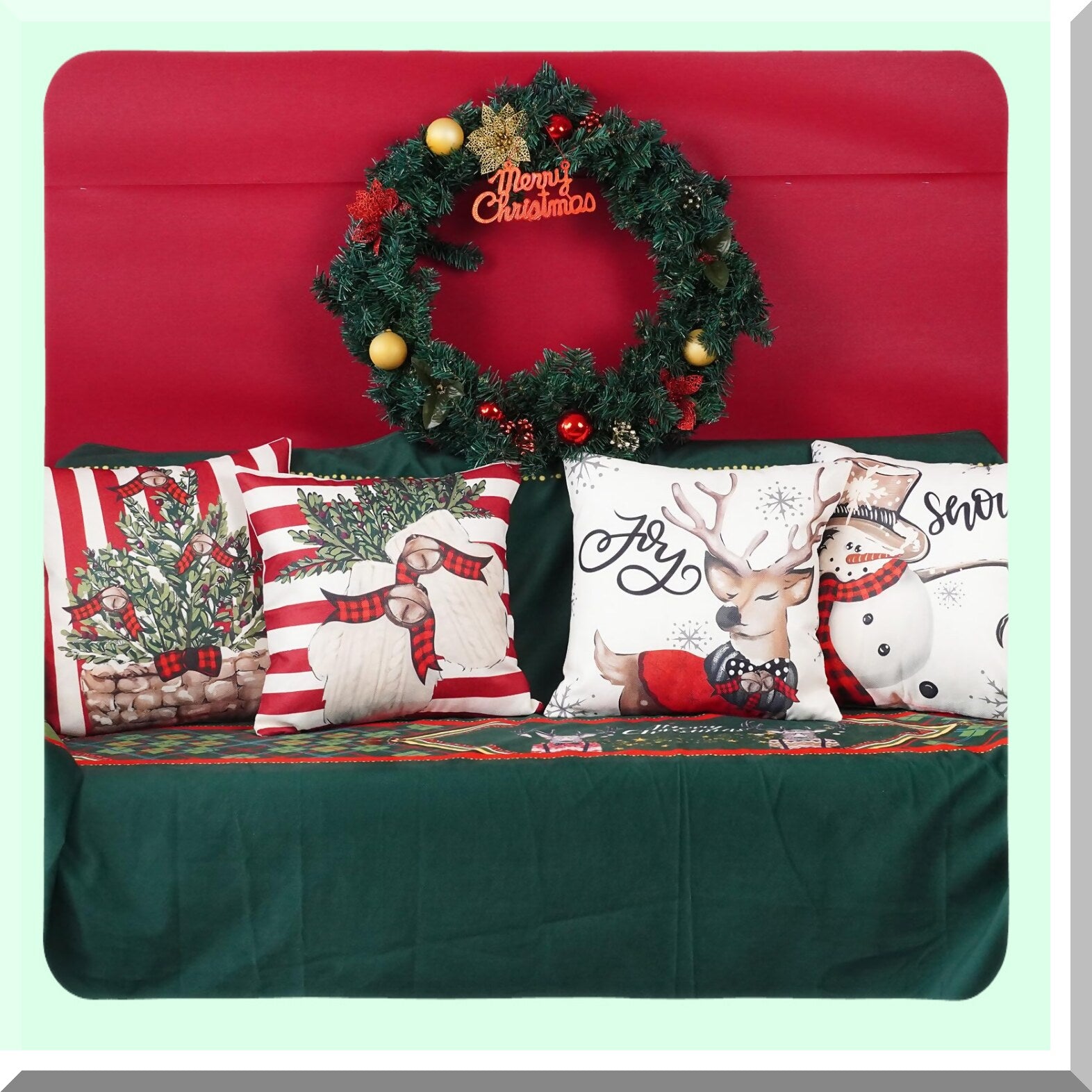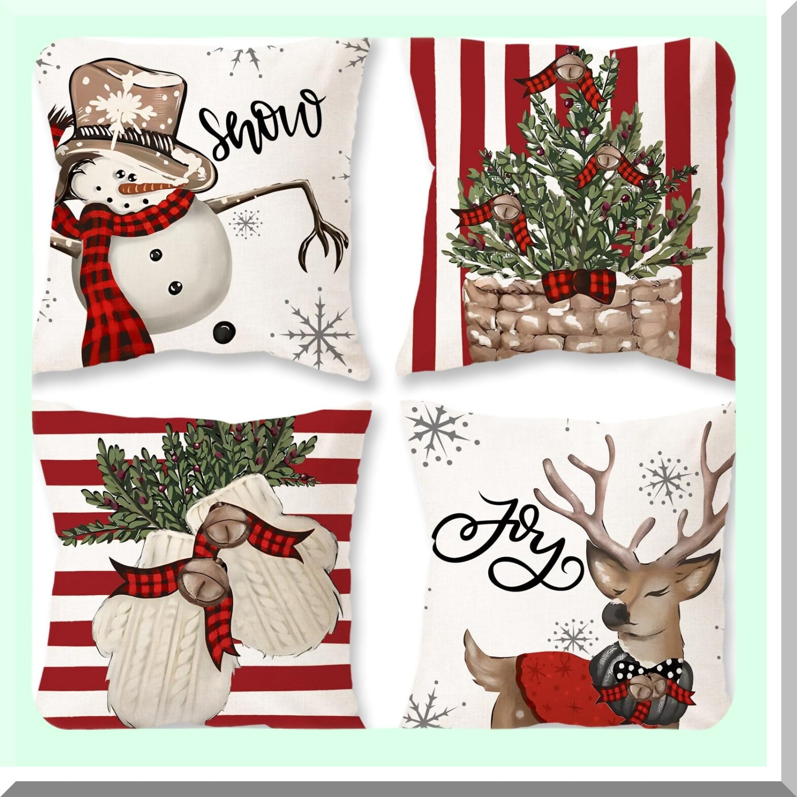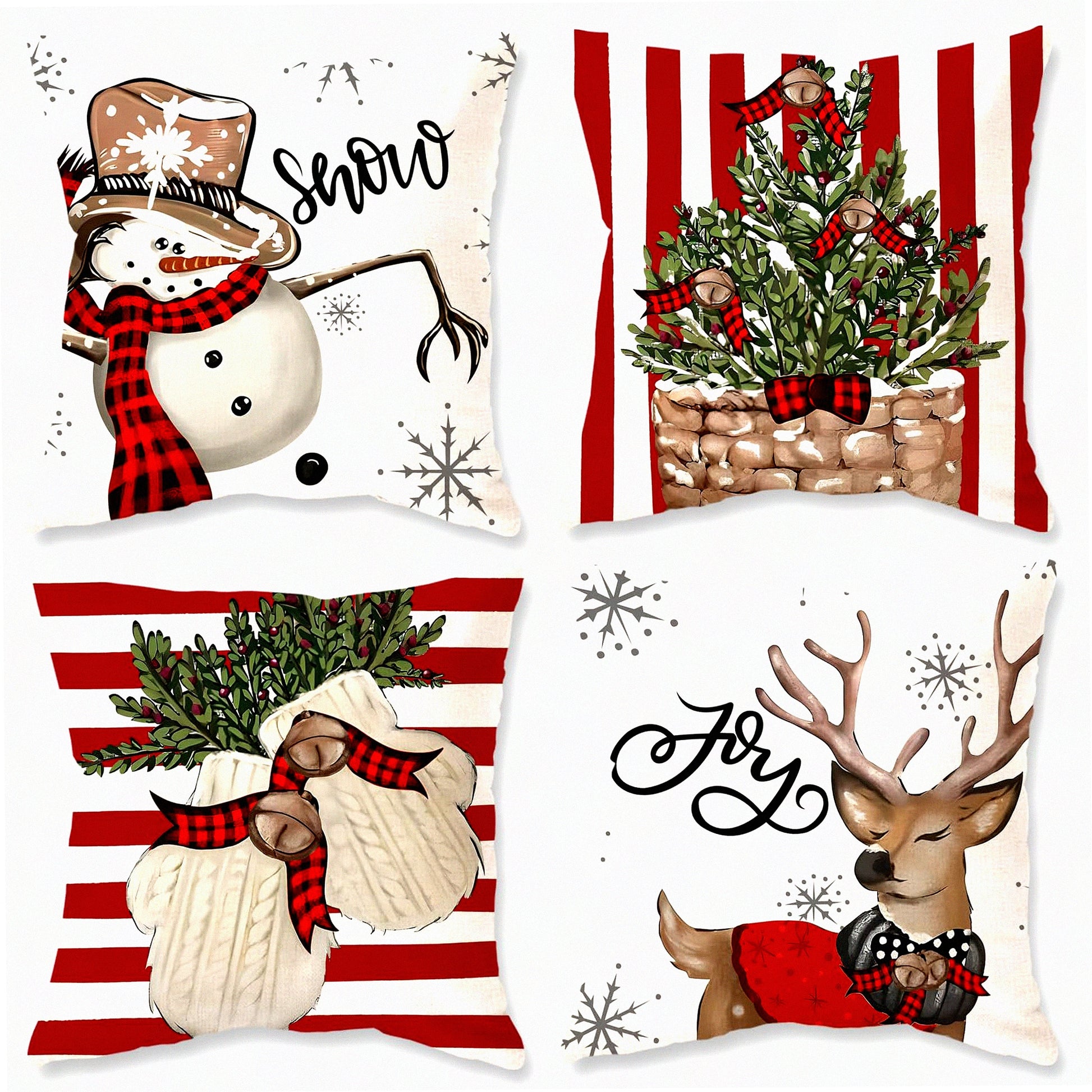 Winter Wonderland Pillow Cover Set - Snowman Reindeer Gloves Throw Pillows - Red Stripe Holiday Decoration - Sofa Couch Home Decor - 18x18 Set of 4