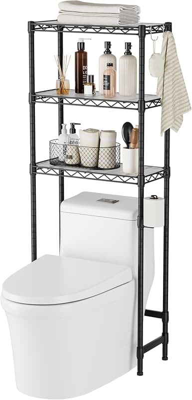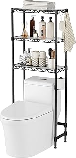 This 3-tier bathroom organizer provides practical storage space with adjustable shelves and baskets. Designed to be placed over the toilet, it helps maximize bathroom storage in limited spaces. The freestanding unit features a sturdy frame and multiple levels for organizing toiletries, towels, and other essentials. The adjustable shelves allow customization to fit various items, while the baskets offer convenient storage options. Its compact design makes it suitable for small bathrooms, helping to keep the area tidy and organized. The black finish adds a sleek look that complements different bathroom styles. Easy to assemble and maintain, this storage shelf offers a functional solution for bathroom organization needs.
