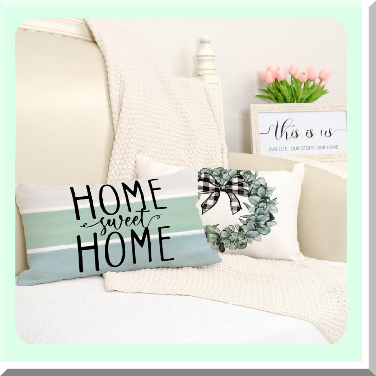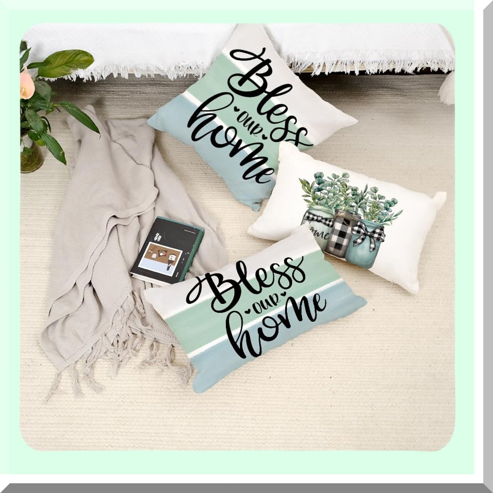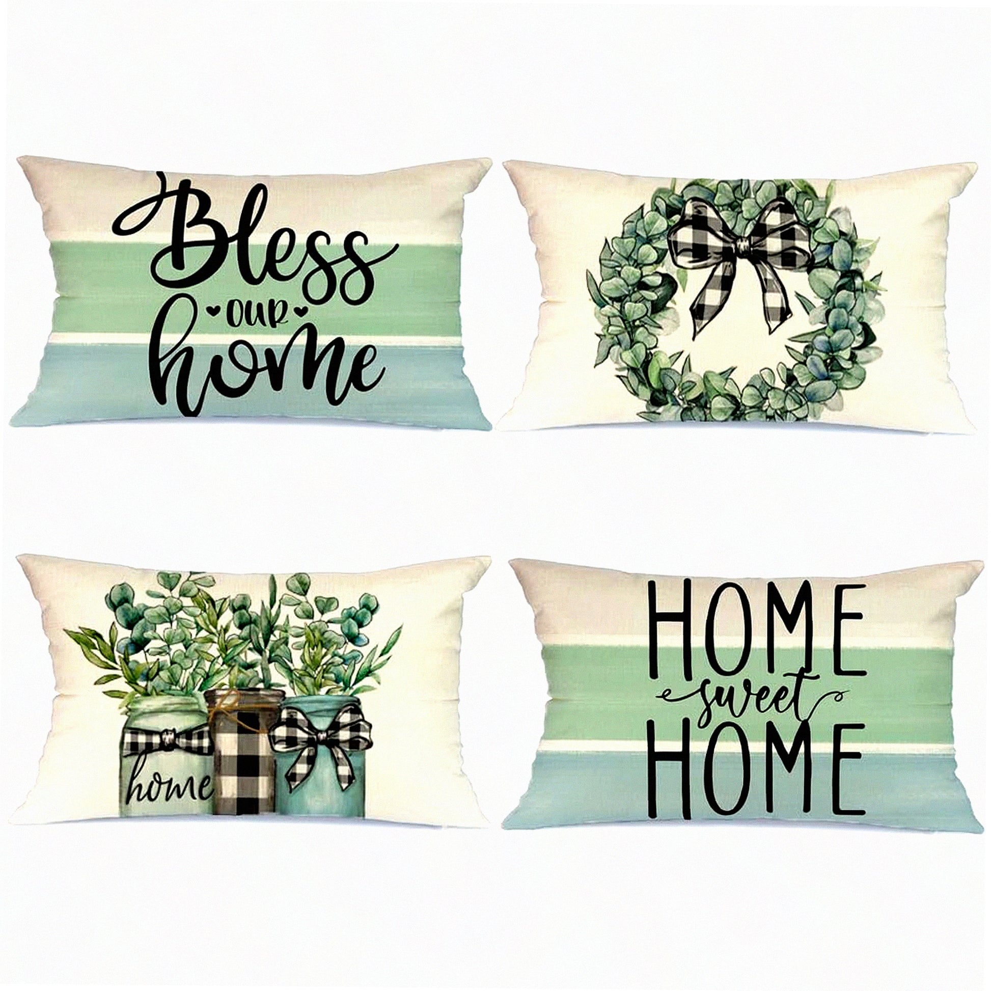 Eucalyptus Blessing Pillow Covers - Set of 4 Buffalo Plaid Cushion Cases for Home Sweet Home Decor. Spring Farmhouse Decor for Couch Sofa.