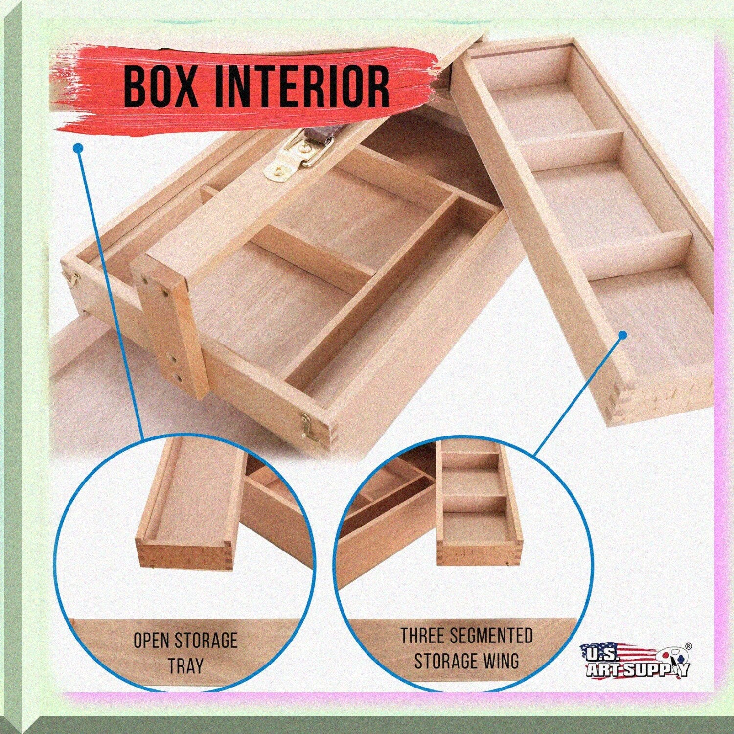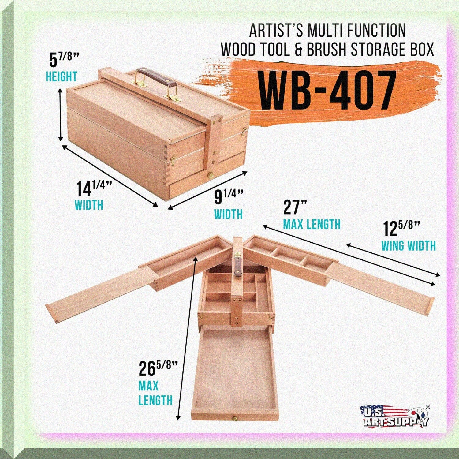 This large multi-function wooden artist tool box features a convenient clic design with multiple compartments for efficient organization. It is designed to protect, organize, and transport your paints, brushes, tools, and supplies. The box includes two slide-open trays on the top for easy access to brushes and other small items. Additionally, it has a full-size pull-out drawer for extra storage space. Made from sturdy yet lightweight wood, the box measures 14-1/8 inches wide, 9-1/4 inches deep, and 6 inches tall. Its versatile design makes it suitable for various art supplies, providing a practical solution for artists to keep their tools secure and accessible. The multi-functional compartments help in maintaining an organized workspace, whether at home or on the go. This artist tool box combines durability with convenience, making it an essential accessory for artists seeking a reliable storage solution.