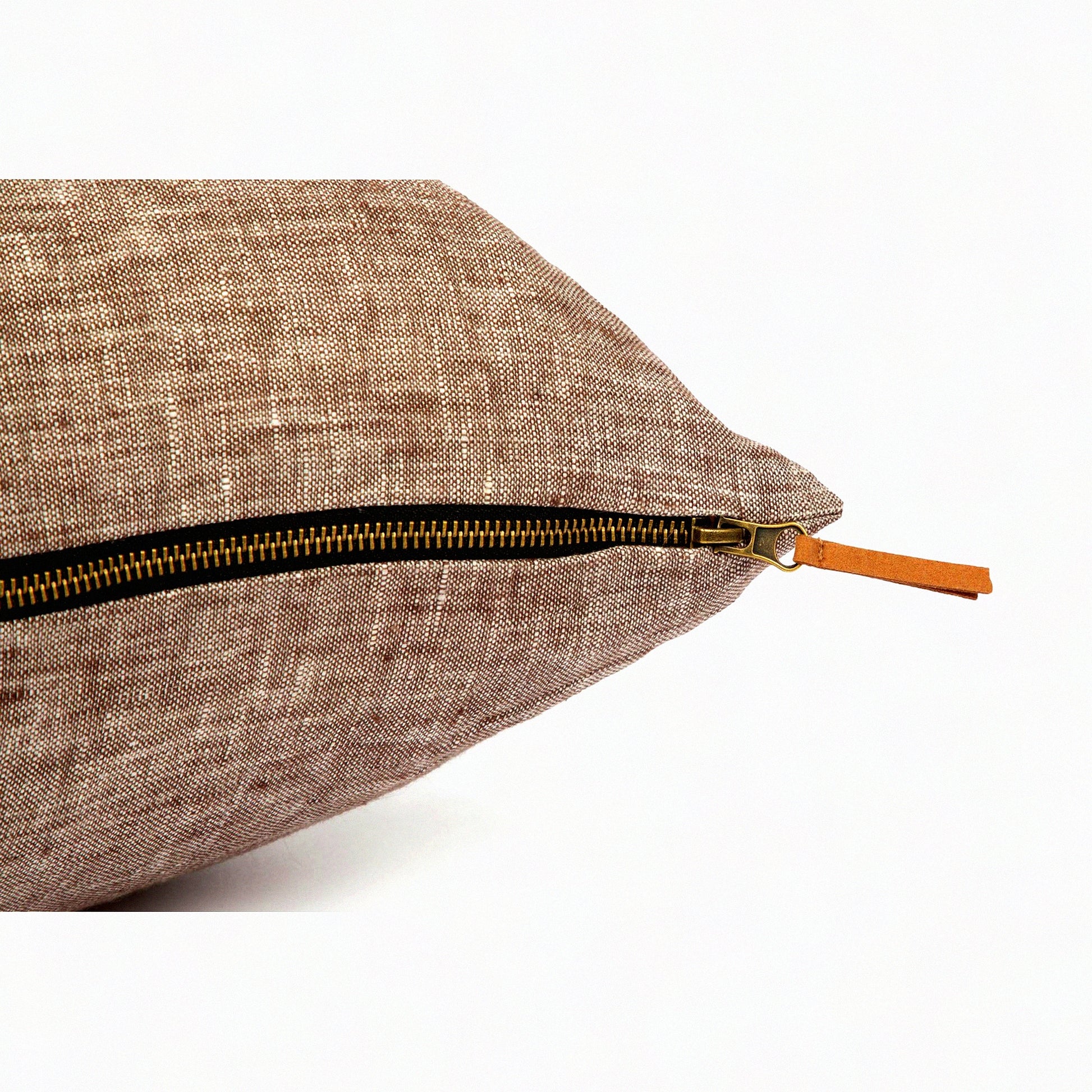 Vintage Brown Linen Throw Pillow Cover - Lightweight Slub Fabric with Metal Zipper Closure and Suede Pull - 20x20 Decorative Cushion Case