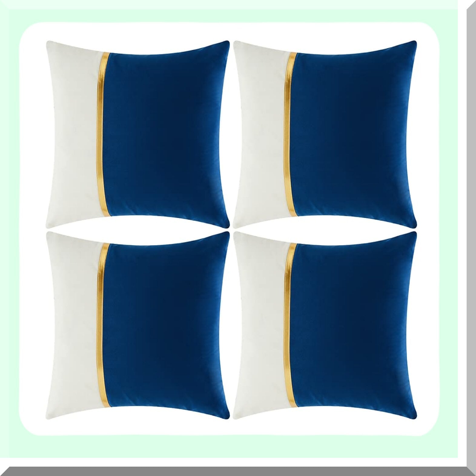 Royal Blue Velvet Patchwork Pillow Covers - Set of 4 | Gold Leather Accent | Luxury Home Decor Cushion Cases for Living Room Couch Bed | 18x18 Inch Square | Blue and White Theme