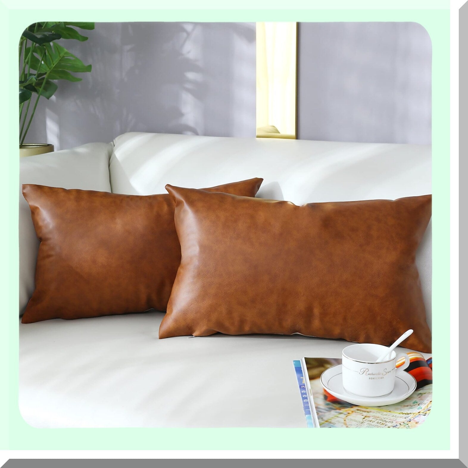Rustic Leather Lumbar Pillow Covers Set - Modern Farmhouse Style 12x20 Inch Accent Pillowcase for Bedroom Living Room Sofa - Brown Throw Pillows 30x50cm