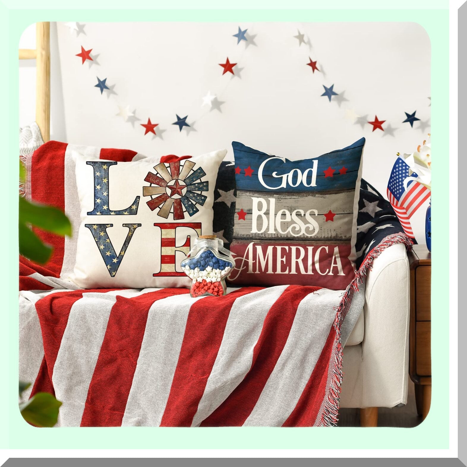 Patriotic Blessings Pillow Covers - Set of 4, Faith Family Freedom 4th of July Independence Memorial Day Decorations for Sofa Couch - 18x18