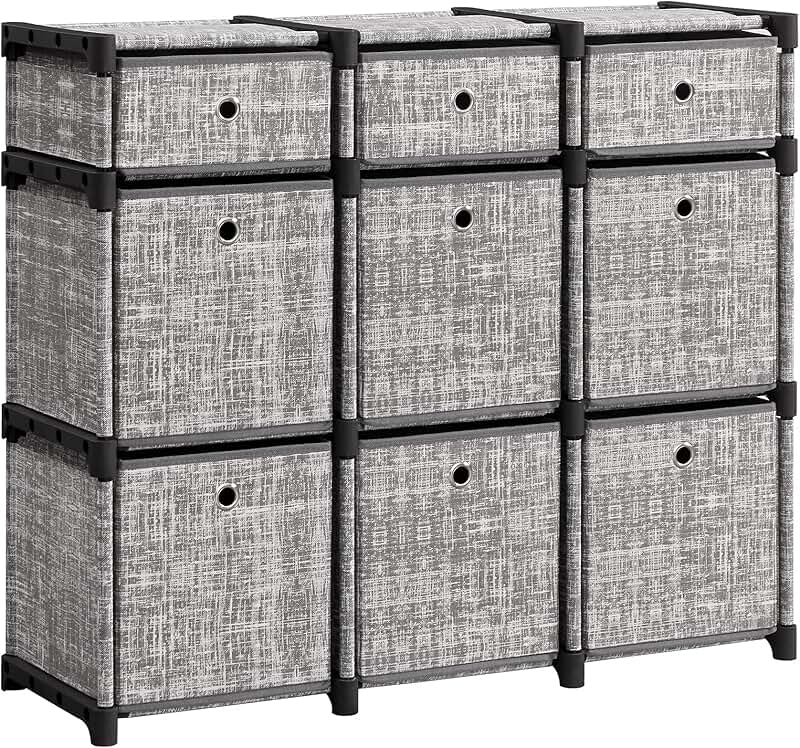 This set includes nine fabric storage cubes designed for versatile organization in various spaces. Each cube provides ample space for storing clothes, accessories, toys, or household items. The fabric material is durable and lightweight, making it easy to handle and reposition as needed. The neutral heather gray color complements different interior styles, adding a tidy and organized look to bedrooms, living rooms, entryways, or closets. The cubes are designed to fit into compatible shelving units or storage systems, helping to maximize space and keep belongings neatly arranged. Their compact size allows for easy stacking or placement on shelves, making them suitable for small or cluttered areas. These storage organizers are practical solutions for maintaining a clean and orderly environment, whether for everyday use or seasonal storage. The set offers a simple, effective way to enhance organization and accessibility in any room.