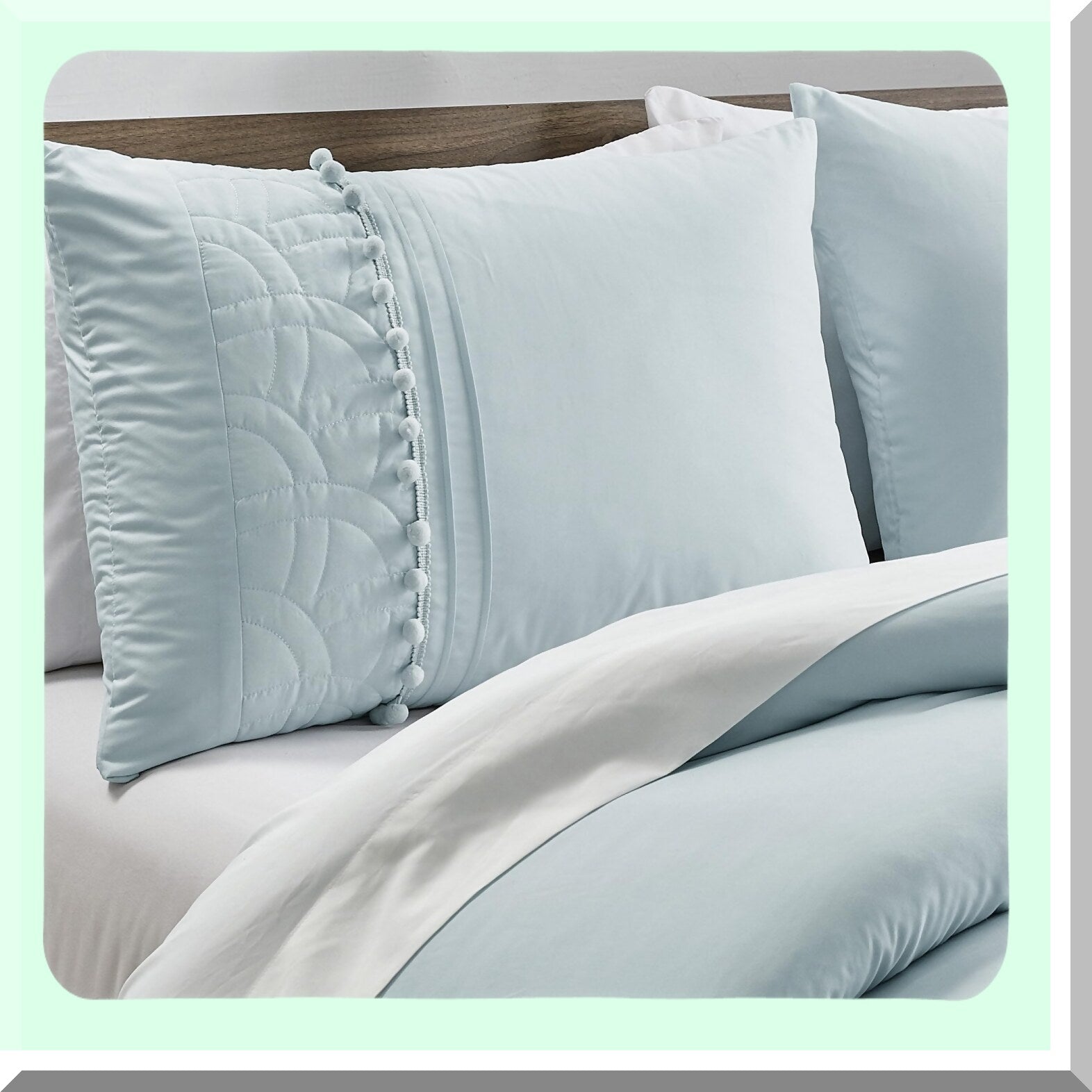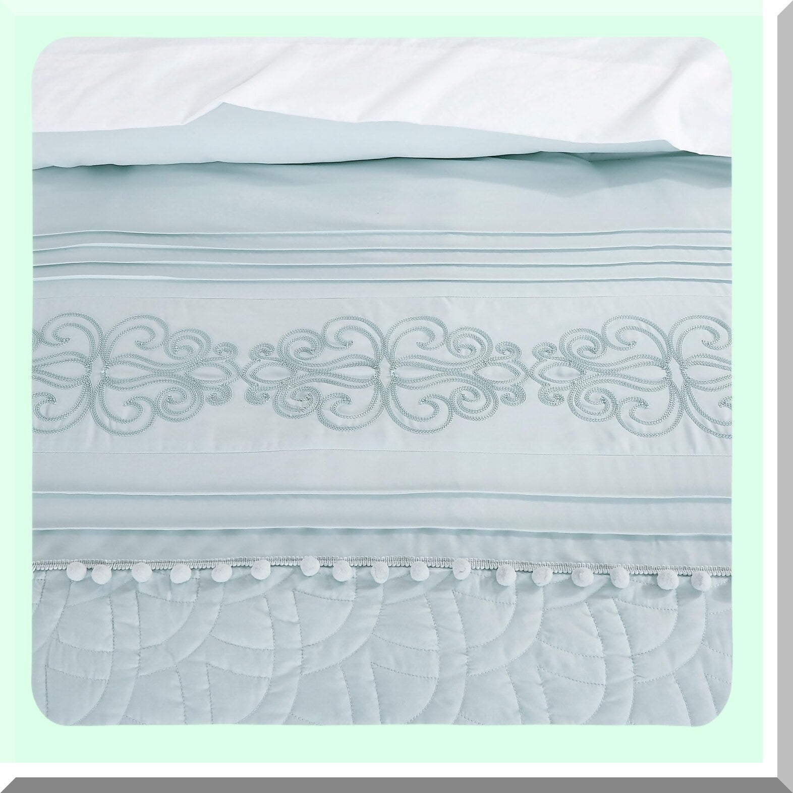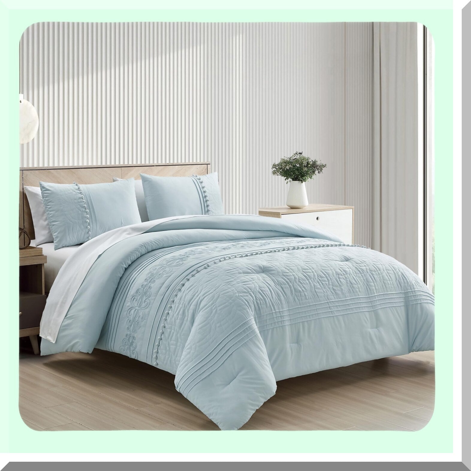 Floral Pom Pom California Comforter Set - 7-Piece Chenille Embroidered Stripe Bed in a Bag with Sheets, All Season Bedding - Pale Blue