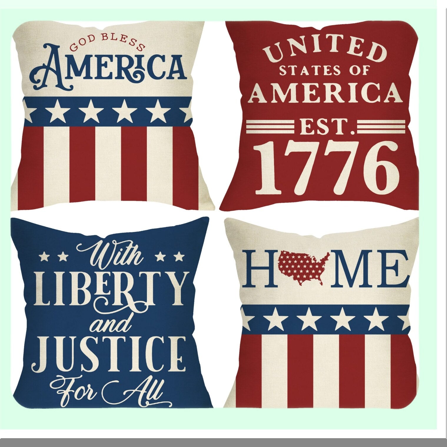 Patriotic Star Stripe Blessing Throw Pillow Set - Liberty & Justice Cushion Case - USA United States Decor - 4th of July Home Decor 18x18 - Set of 4