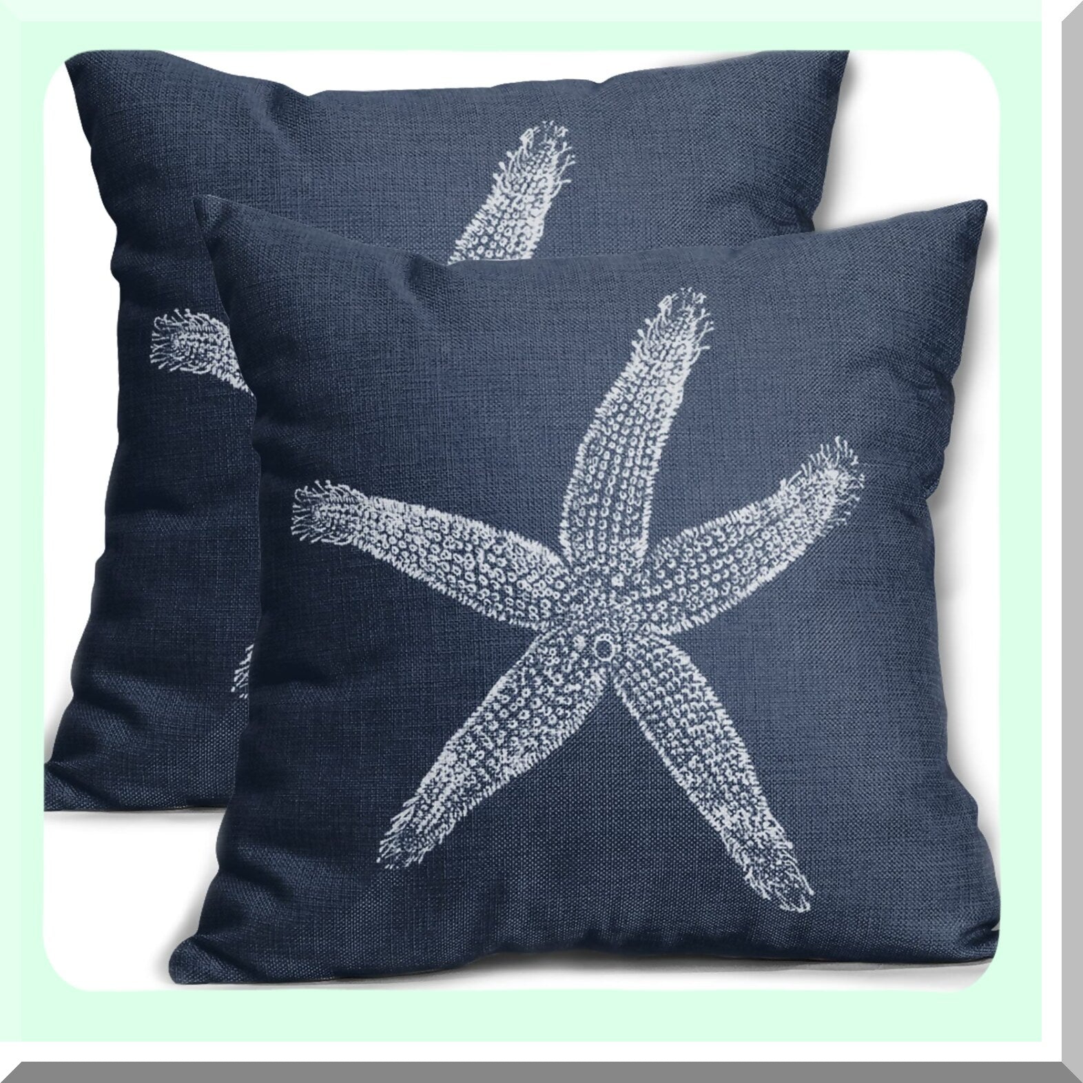 Nautical Starfish Beach Pillow Covers - Coastal Decorative Linen Cushion Cases for Home Bed Sofa - Navy Blue Throw Pillows 20X20 Inch Set of 2