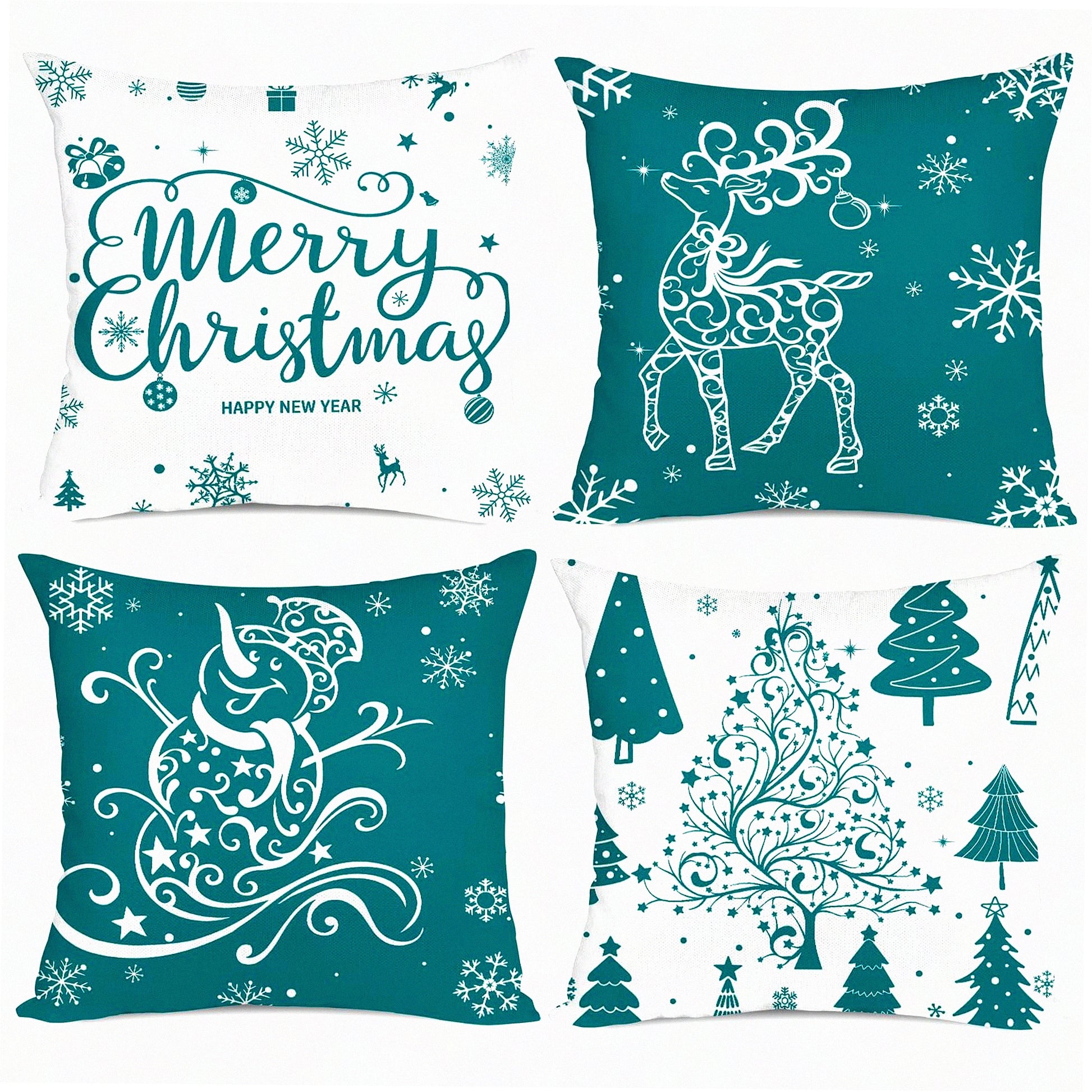 Winter Wonderland Holiday Pillow Covers - Set of 4 16x16 Teal Throw Pillow Covers with Trees, Deer, Snowman & Merry Decor for Farmhouse Decor