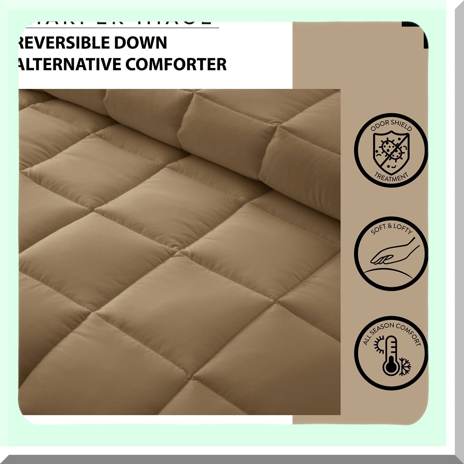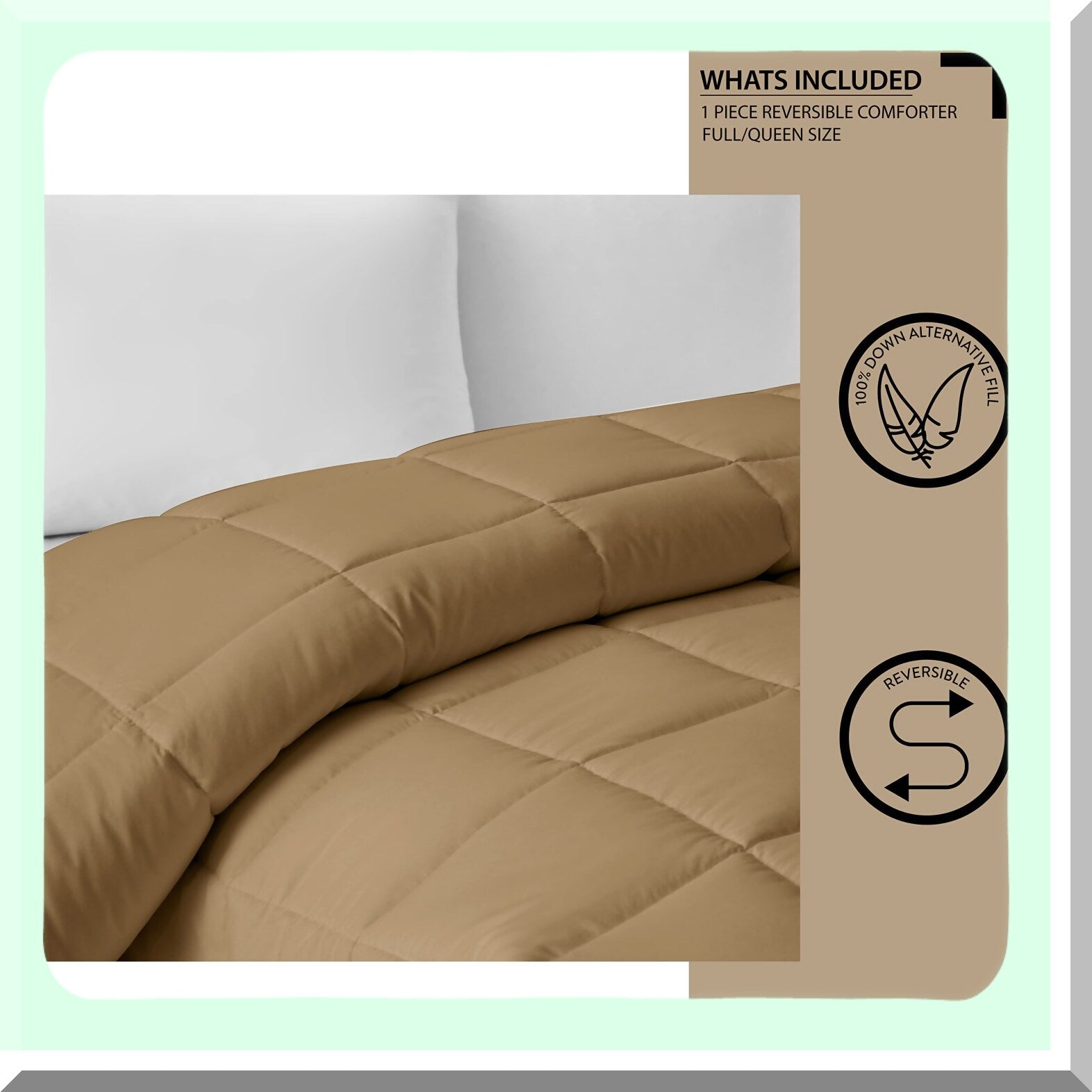 Luxury Comfort All Season Reversible Comforter - Full/Queen Size - Tan - Box Stitched - Hypoallergenic Down Alternative - Cozy Bedding Solution