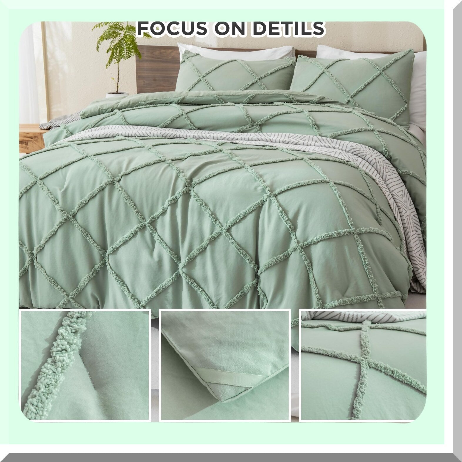 Luxury Sage Green Boho Comforter Set - Geometric Textured Bedding (104x90 inches) - Soft Microfiber - Lightweight - All Season - 3 Pieces with 2 Pillowcases