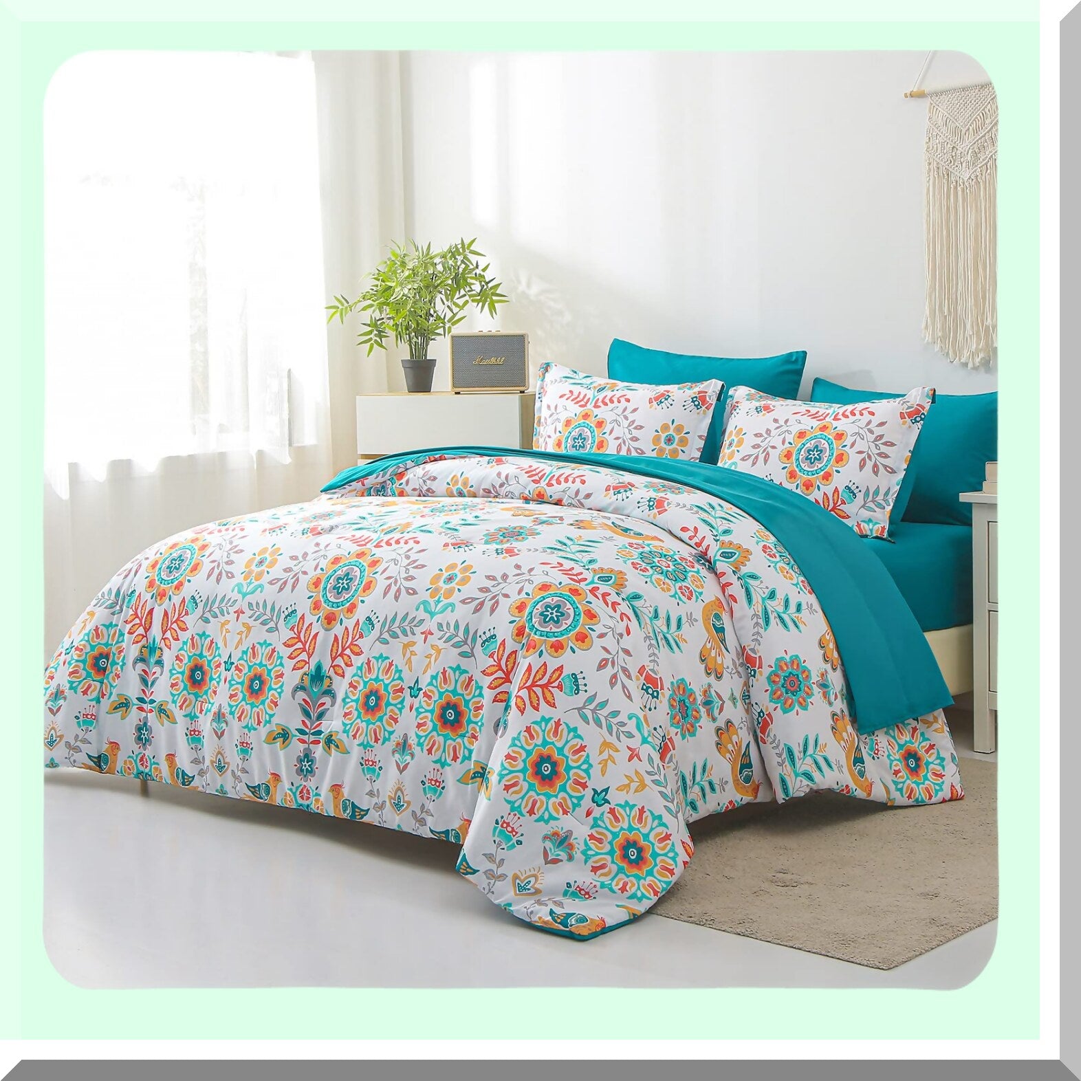 Boho Medallion Dream 7-Piece Bedding Set - Bohemian Floral Comforter with Sheets, Soft Microfiber All Season Bed in a Bag, Teal Blue Theme