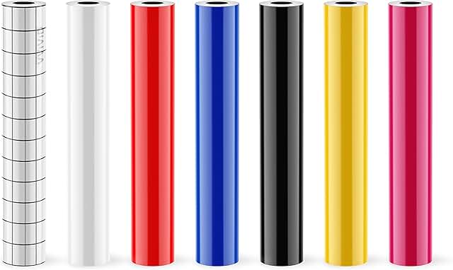 This bundle includes six rolls of multi-color adhesive craft vinyl, each measuring 12 inches by 5 feet. The vinyl has a glossy finish suitable for various craft projects. Also included is a 12-inch by 24-inch transfer paper roll to assist with applying the vinyl designs. The set is designed for use with cutting machines and is ideal for creating custom decals, labels, and decorative items. The vinyl is easy to cut, weed, and transfer, making it suitable for both beginners and experienced crafters.