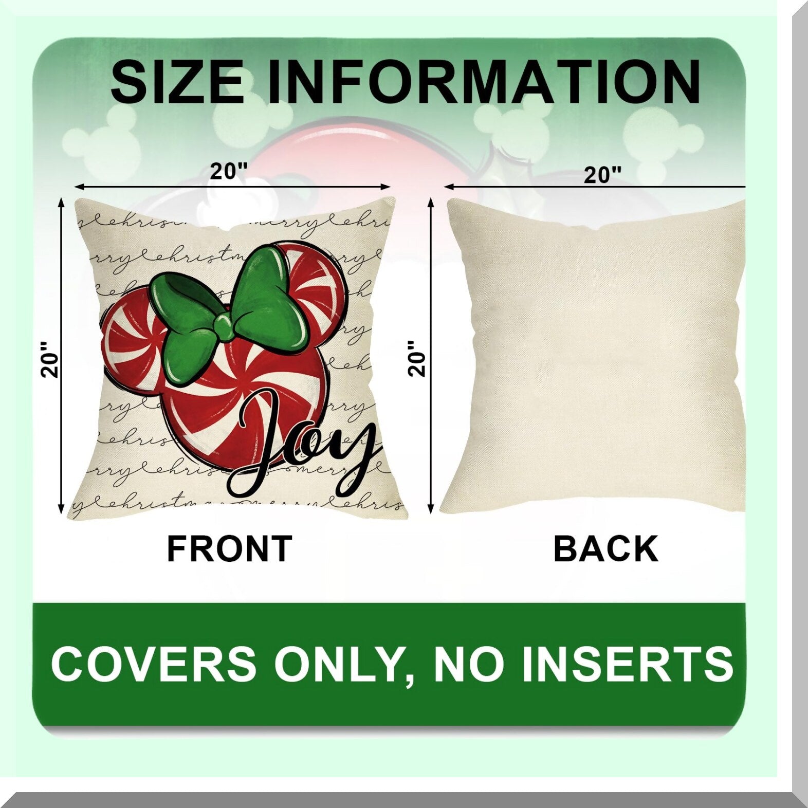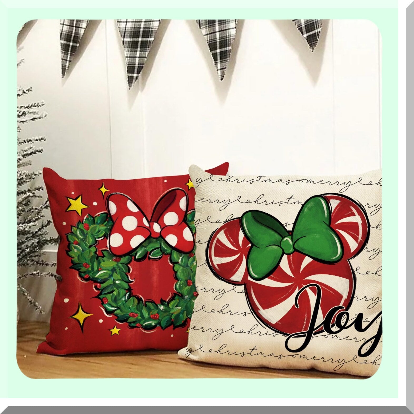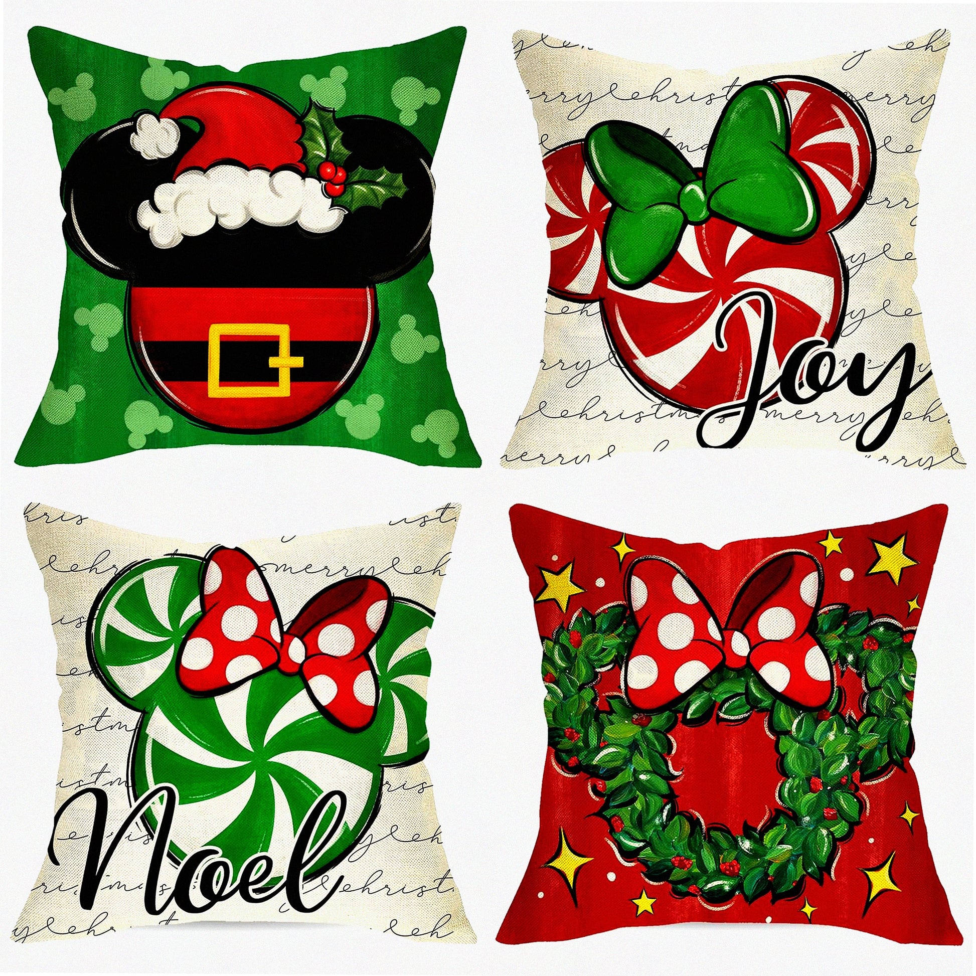 Winter Joy Candy Cane Pillow Covers - Set of 4, Farmhouse Holiday Decorative Cushion Cases for Home Sofa, Merry Mouse Xmas Wreath Theme