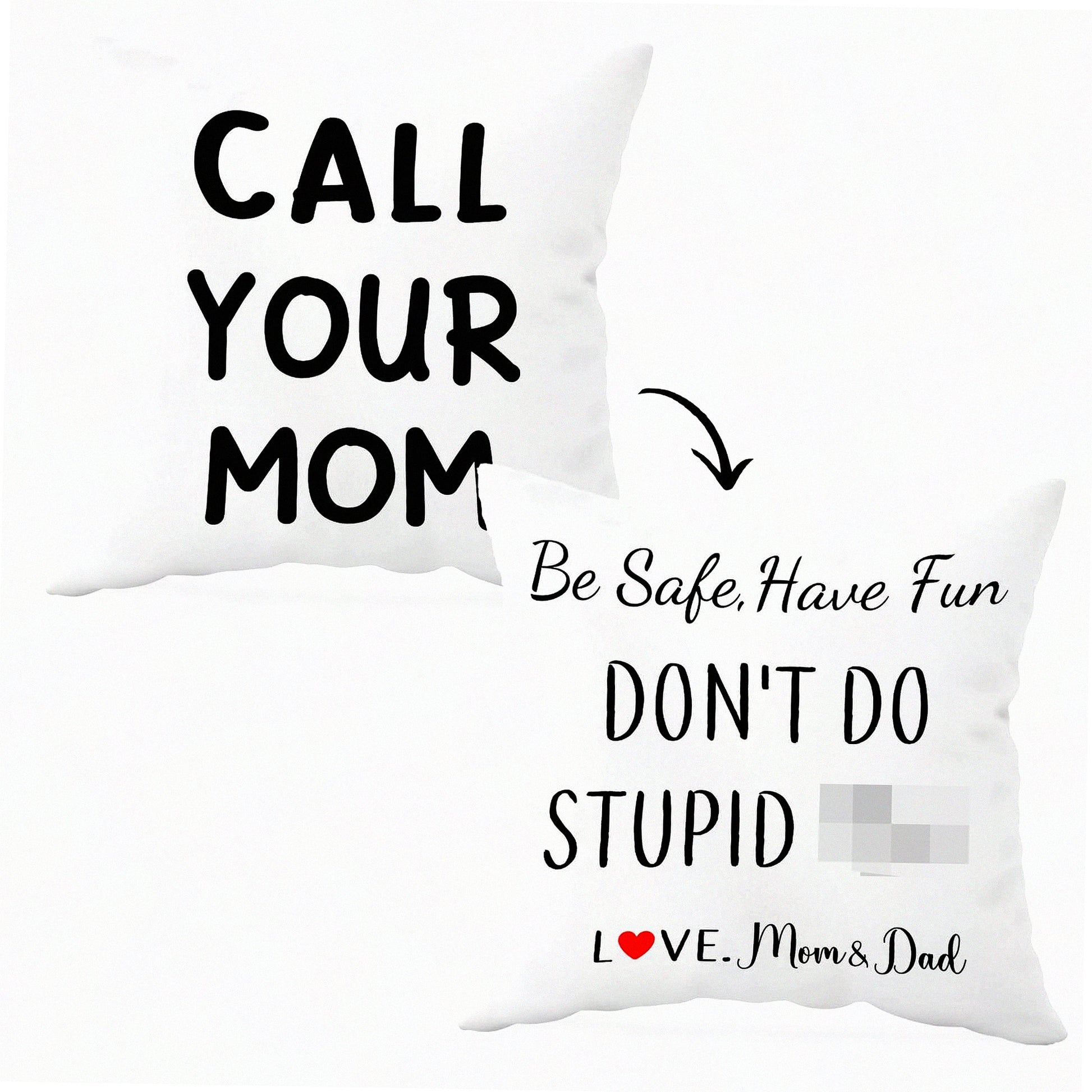 Mom's Safety Reminder Reversible Throw Pillow - Funny Call Your Mom Be Safe Have Fun Don't Do Stupid Love Mom 18''x18'' - Home Decor Gift for Son Daughter Graduation