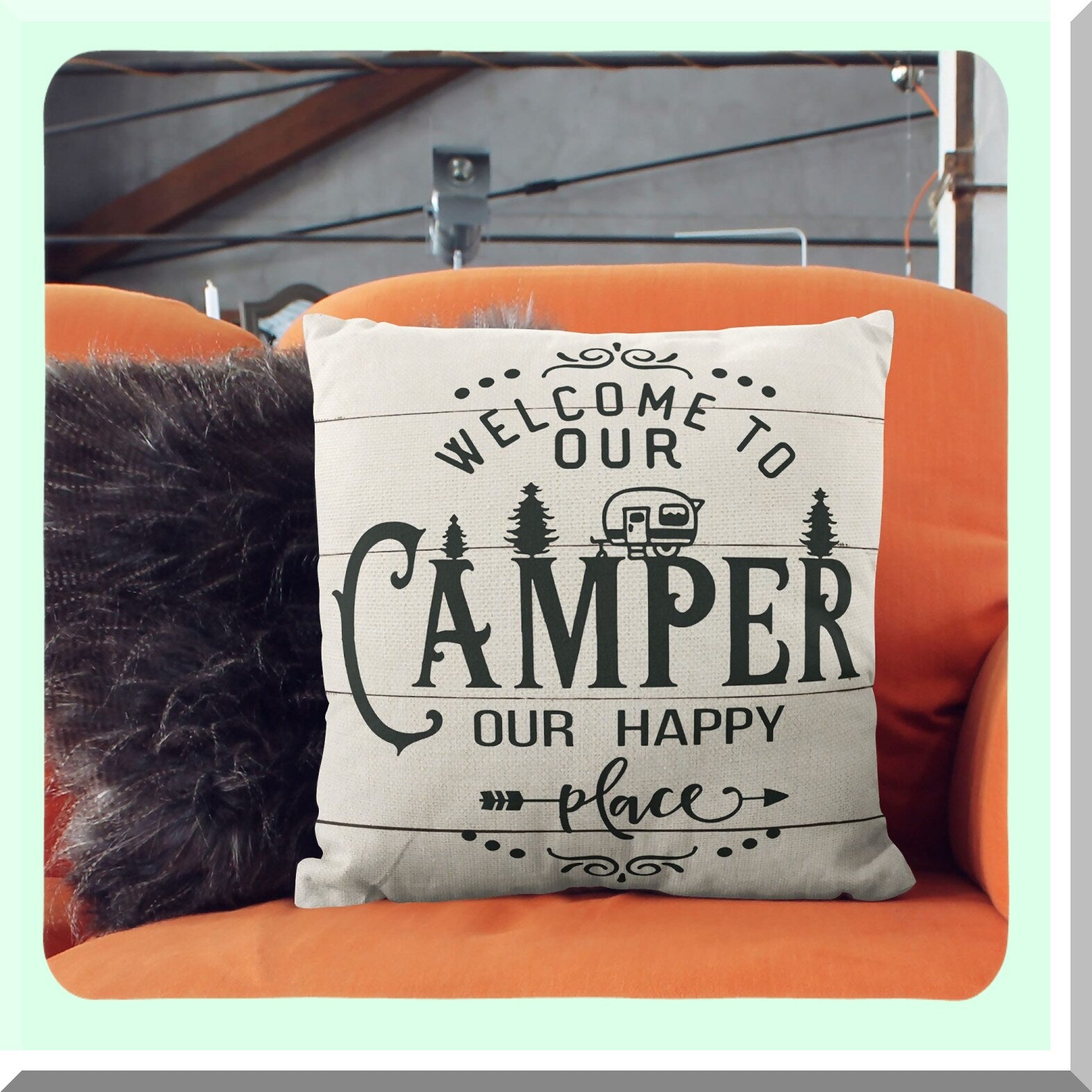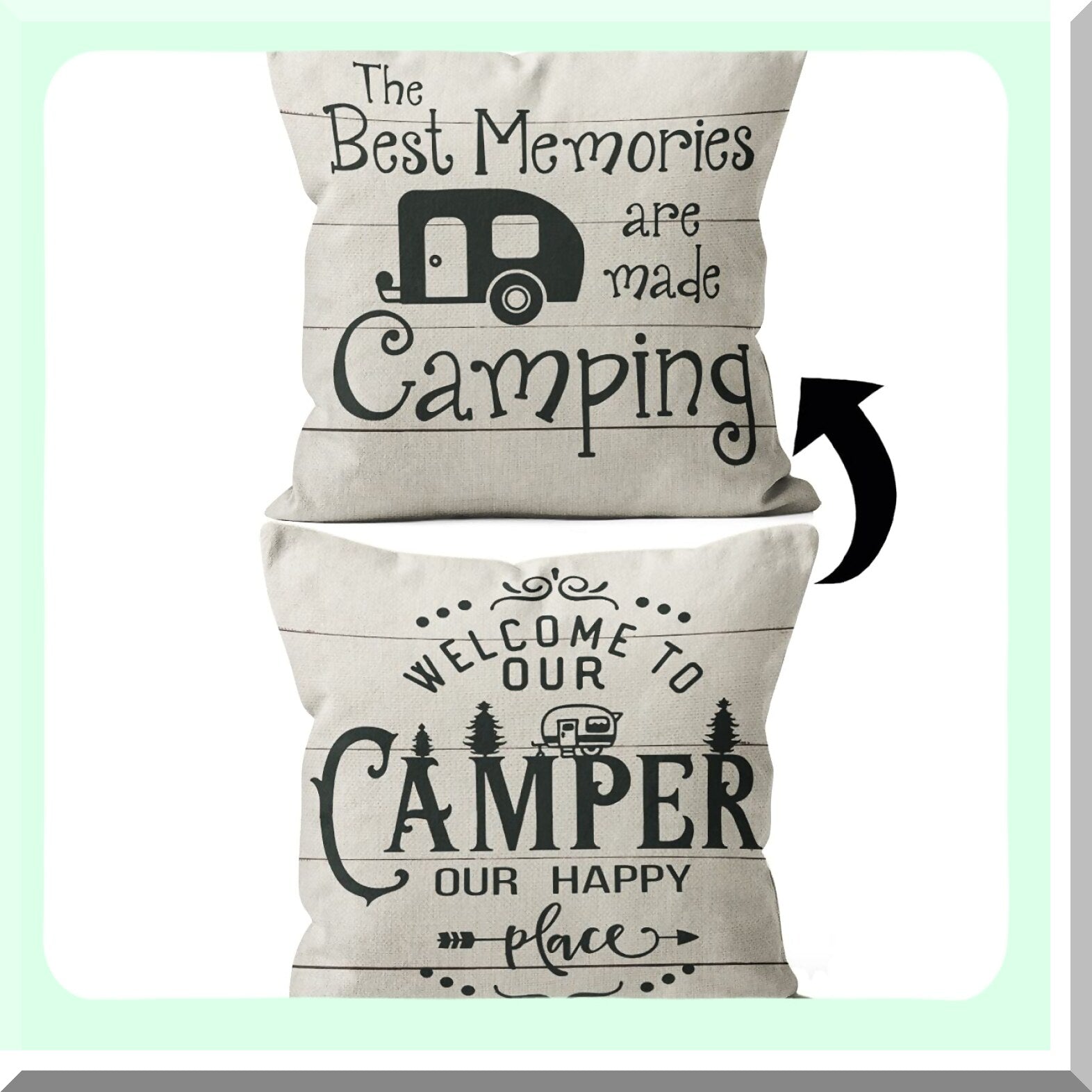 Happy Camper Reversible Pillow Cover - 18x18 Decorations for RV Owners - Cozy Camper Gifts - Interior Decor for Travel Trailers - Camping Theme Pillow Case