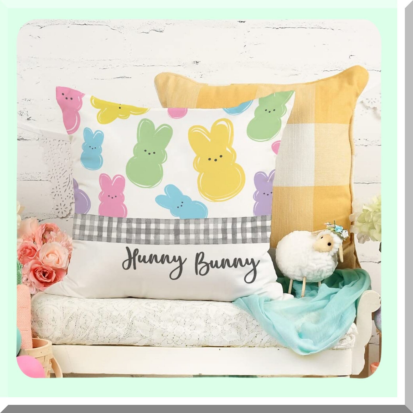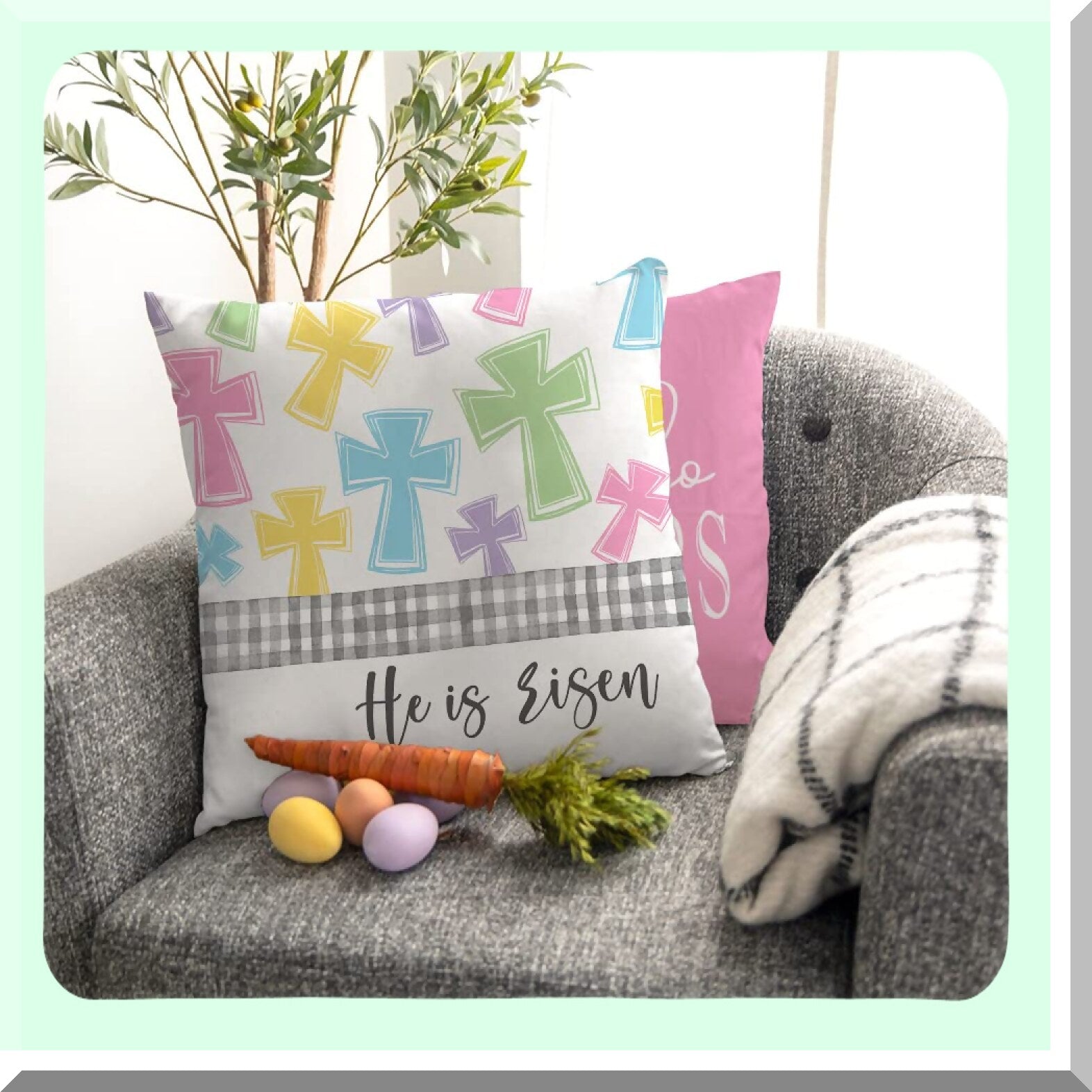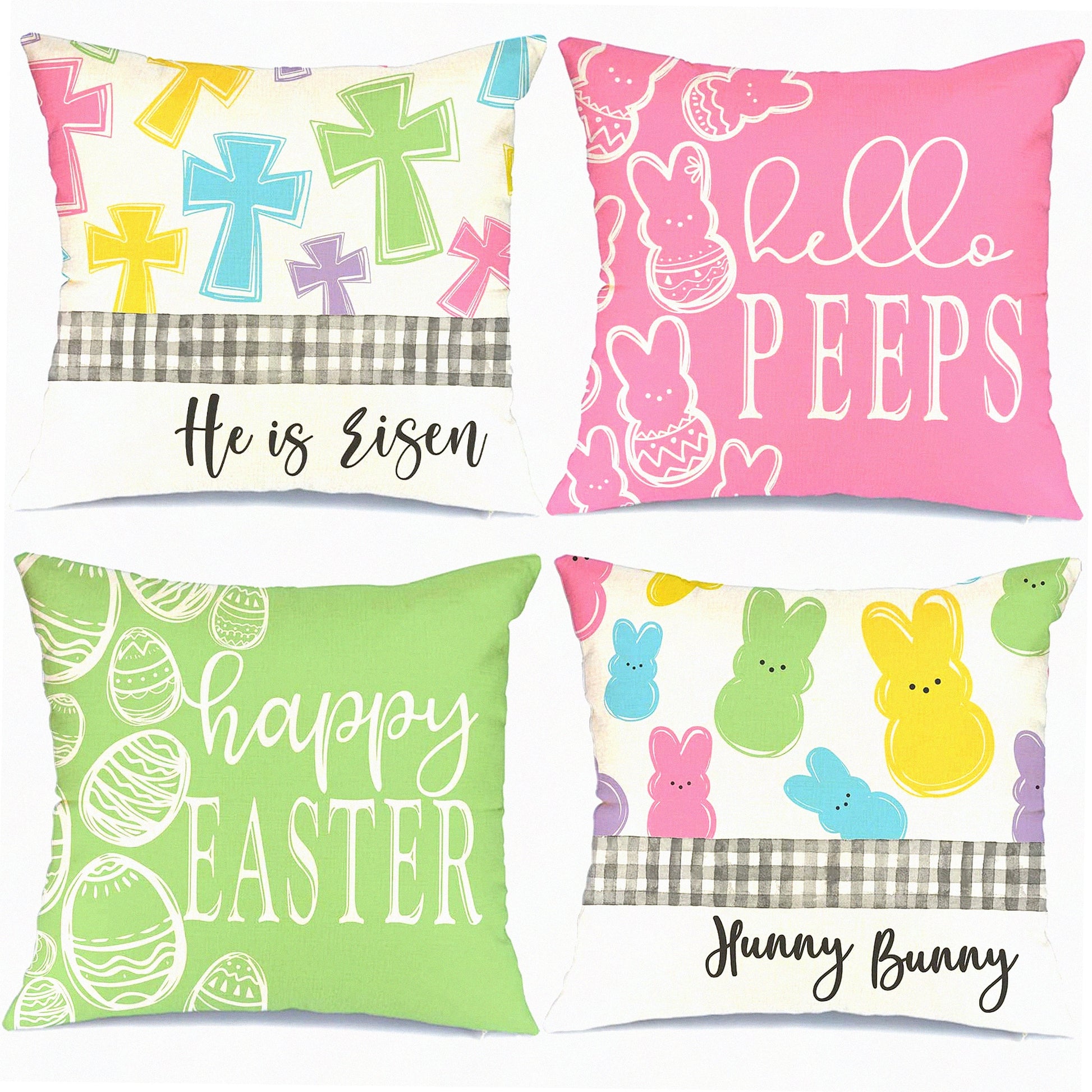 Springtime Joy Pillow Covers - Set of 4 Easter Decorative Cushion Cases 18x18 - Hello Peeps, He is Risen Cross, Hunny Bunny Design for Couch - G205-18